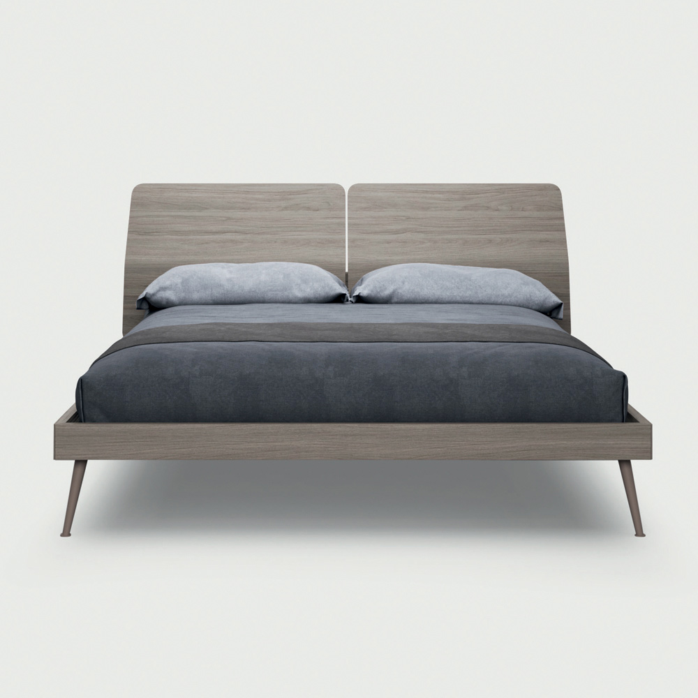 Complete furniture for double bedroom consisting of 4 elements entirely made in Italy . The composition includes a double bed with structure in stained ash veneer with oxidized finish with bed frame in matching material and feet in painted wood , 2 bedside tables and a chest of drawers with 4 drawers in dove gray finish. A sober and elegant design characterized by symmetrical lines and simple shapes that intertwine to create an idea of contemporary furniture revisited in a romantic key. The particular shape of the headboard of the bed enriches the aesthetics of originality and style, embellishing the room with a creative touch. The elegant elements surrounding the bed, the undisputed protagonist of the room, create perfect harmony thanks to sinuous lines that accompany the bedroom with simplicity and lightness.