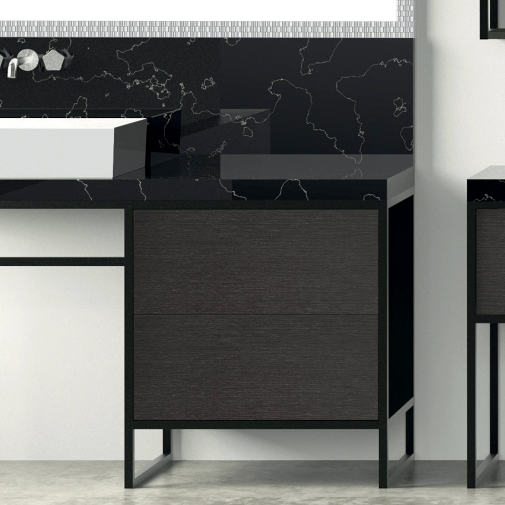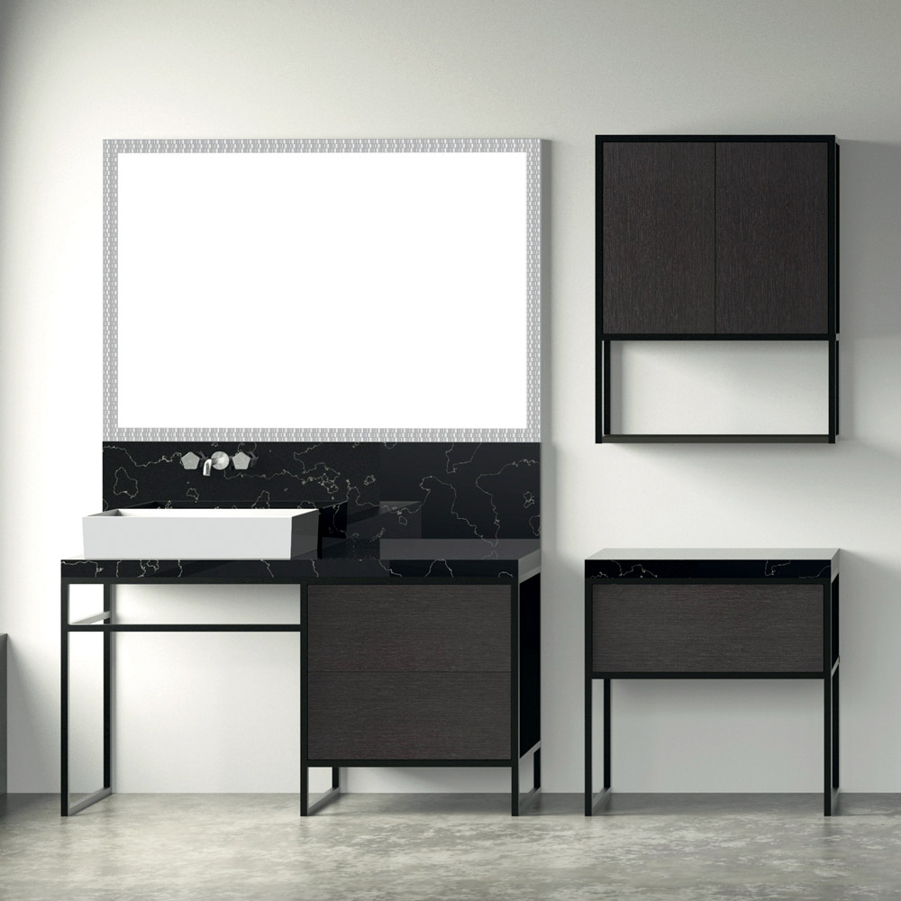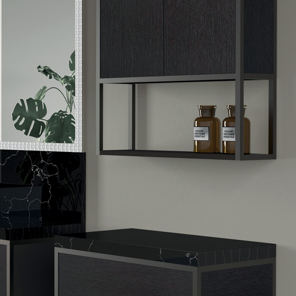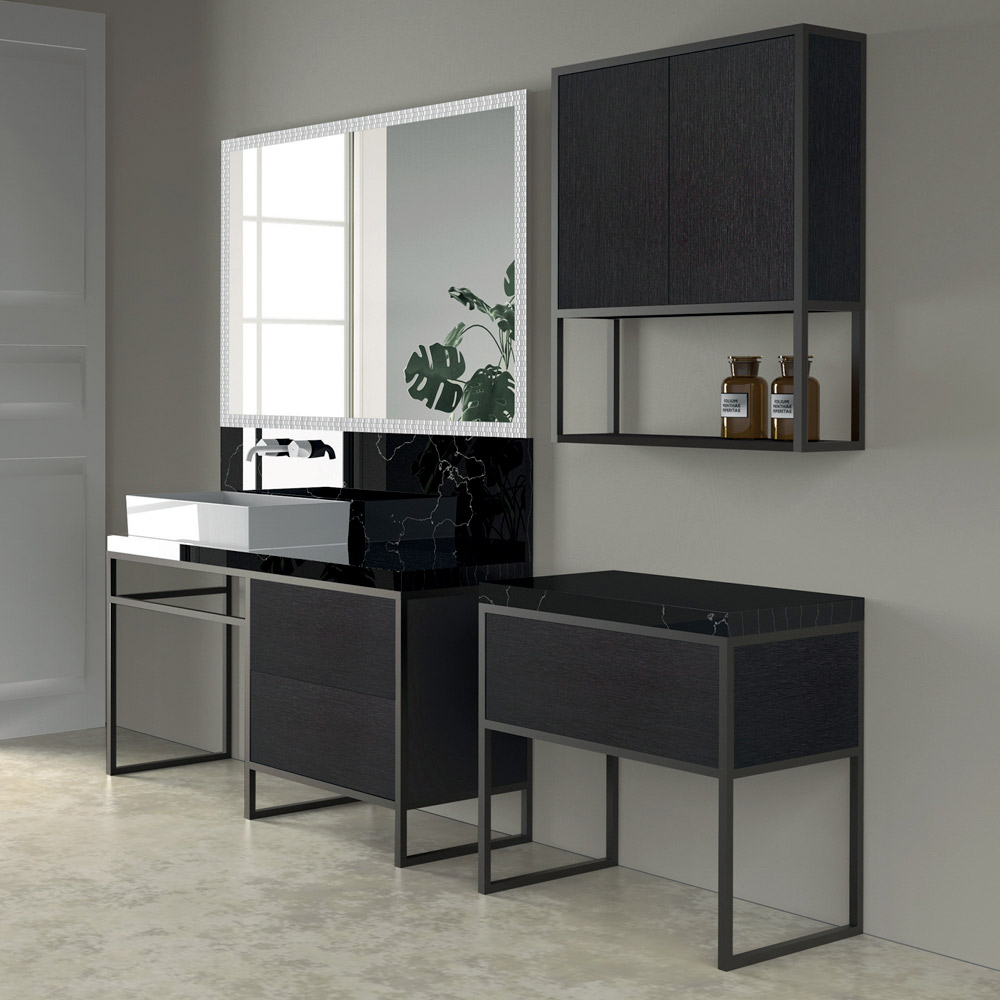 This line of bathroom furniture is characterized by a structure made with a thin matt black painted metal profile that frames the black metal eco-wood doors, creating a harmonious combination of full and empty spaces. The metal finishes of the doors highlight the industrial style of this elegant composition with washbasin base, washbasin, side chest of drawers, mirror and wall unit.
