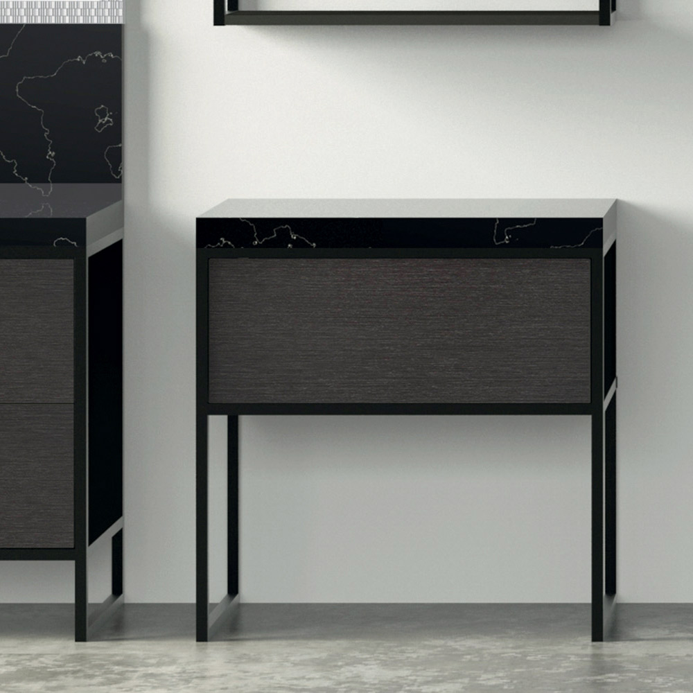 Black bathroom furniture composition with sink, side drawer and towel holder, high quality made in Italy.