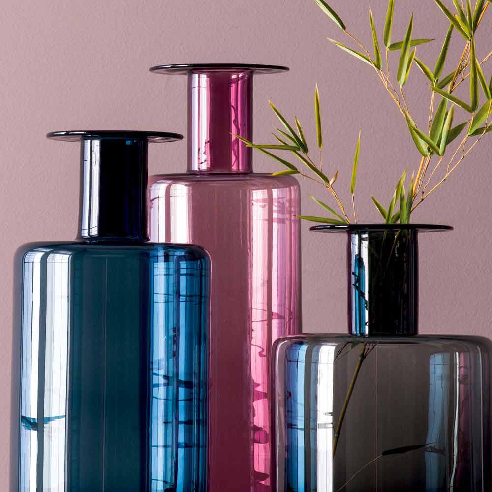Modern composition of 3 decorative indoor vases made of smoked, blue and amethyst colored glass. From the wonders of color and simple and linear shapes comes a furnishing solution capable of enriching any environment with its explosive personalityfor an eccentric and versatile result . Ideal to be used both as flower pots and as simple decorative elements , these three items embody style and contemporaneity for a timeless result capable of astonishing.