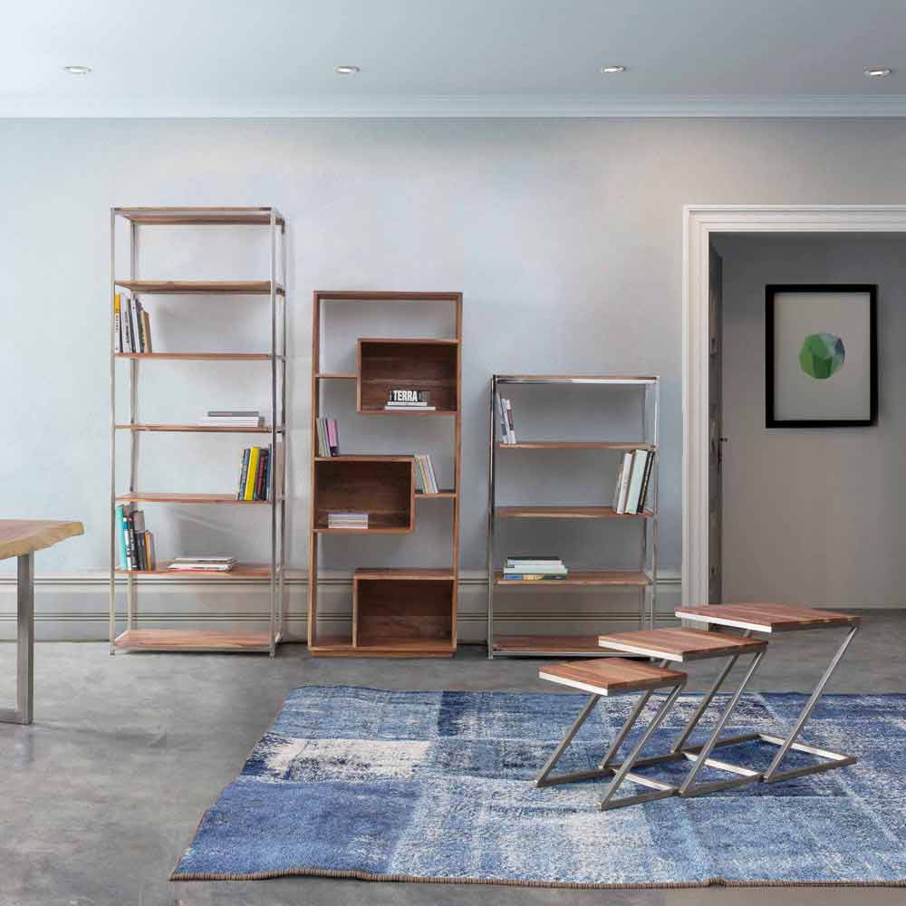 Composition of 3 square coffee tables made of acacia wood and steel.