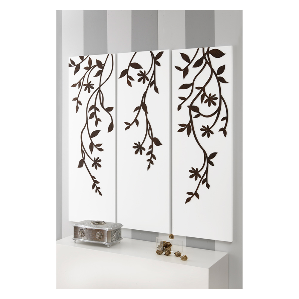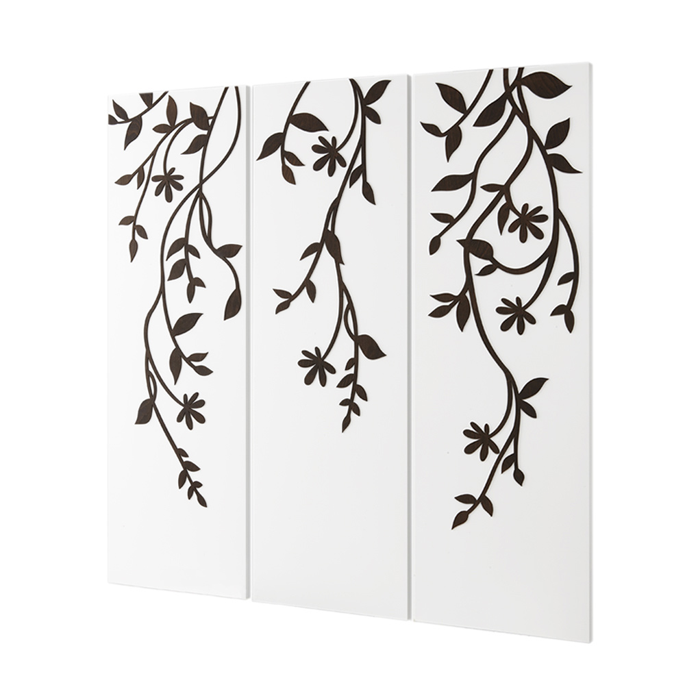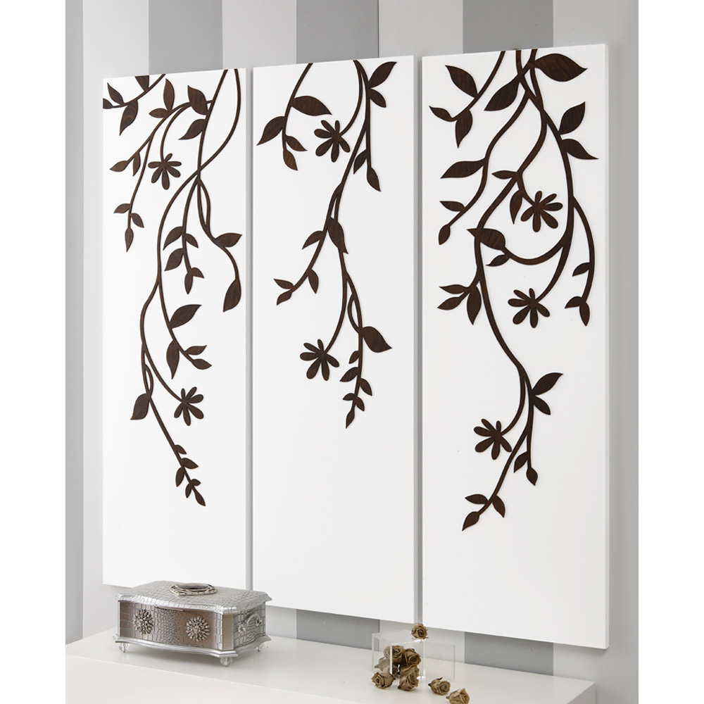 Composition of 3 panels to hang individually in matt white lacquered wood with wengé wood application representing branches with leaves falling from above.