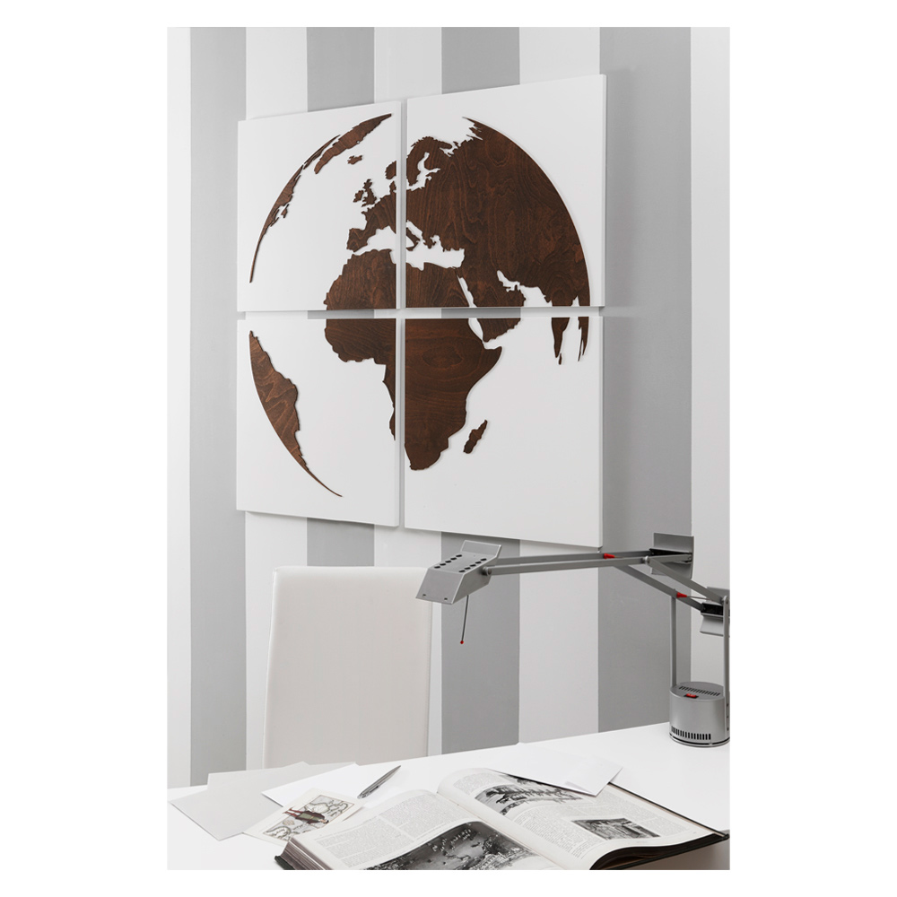 Composition depicting the world made of matt white wood and applied decoration in wengé wood.