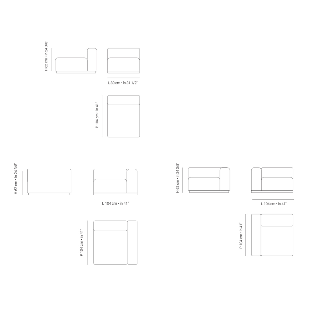 Modular outdoor sofa with marine plywood structure, padding in draining rubber and water-repellent fabric entirely Made in Italy. The set consists of: right, left and a central corner element.