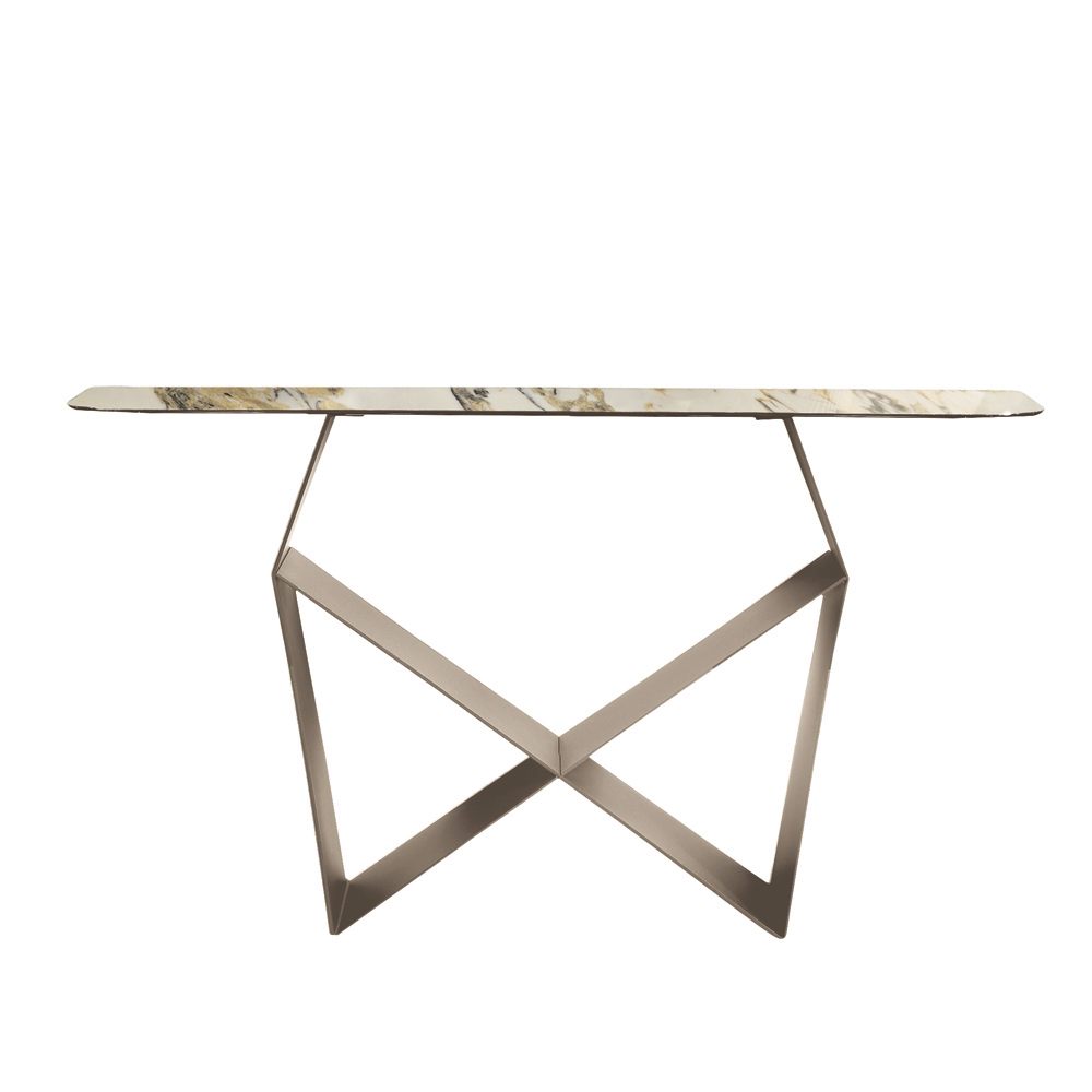The structure stands out for its painted metal base that creates an original bow-tie shape , creating a refined interplay of solids and voids. This detail lends dynamism and momentum to the composition, giving the console a dramatic yet balanced presence.