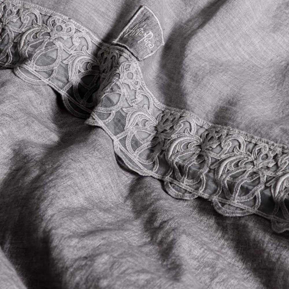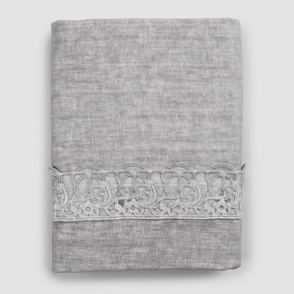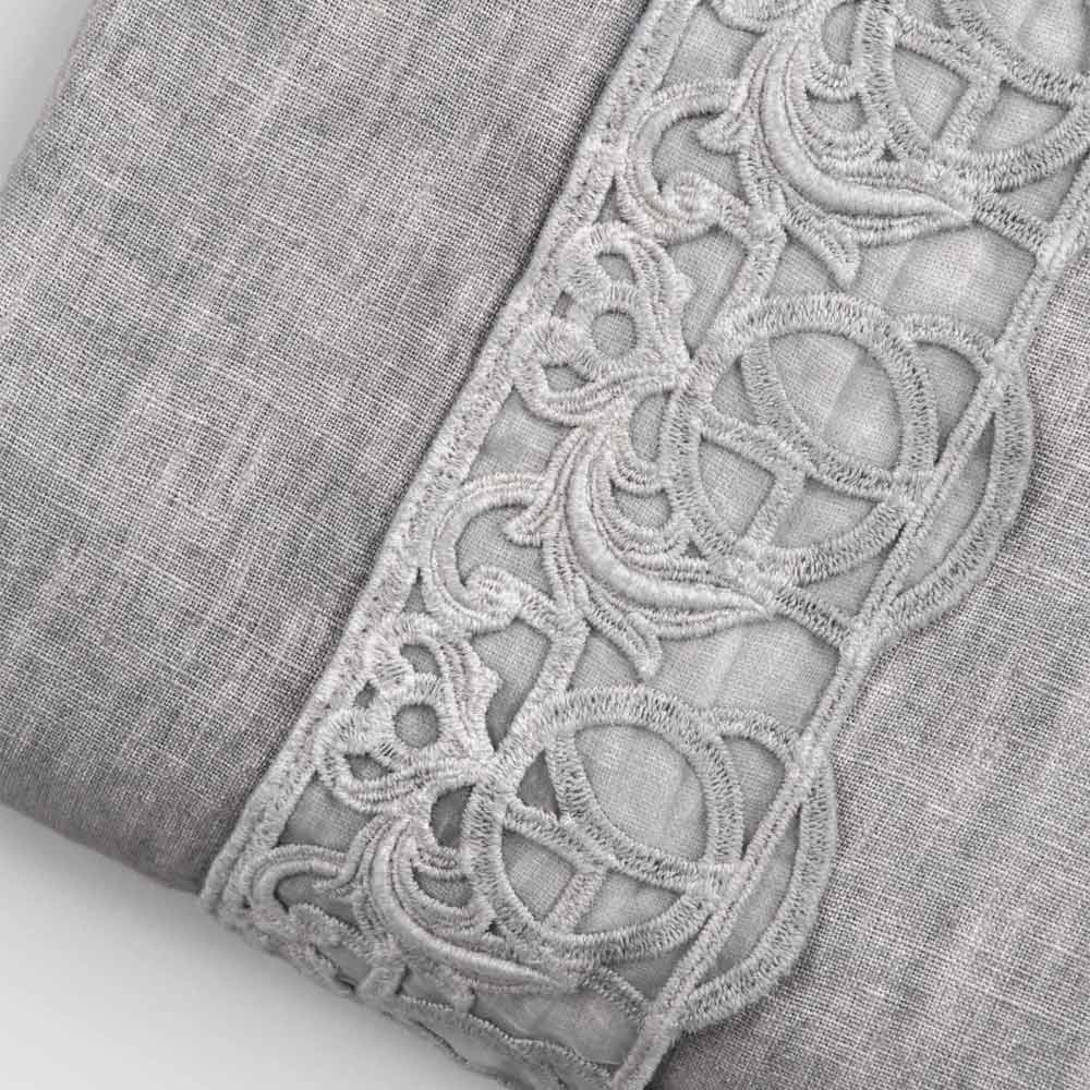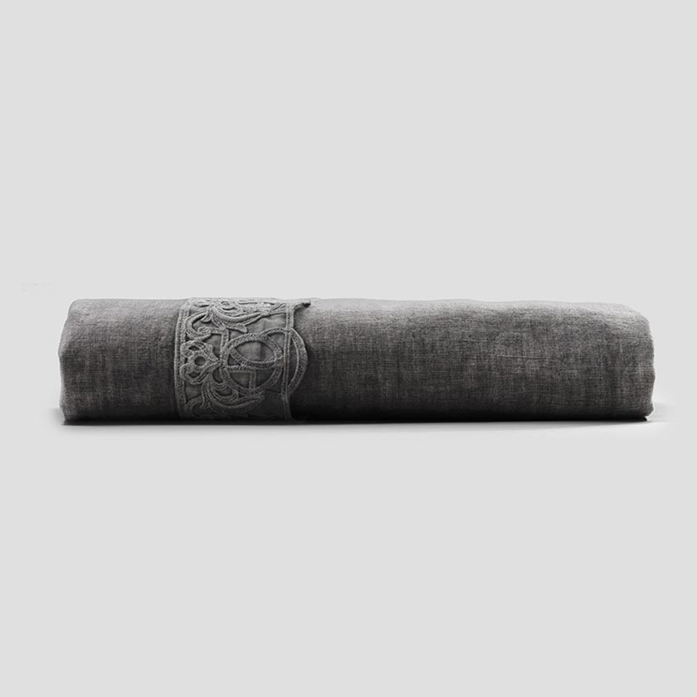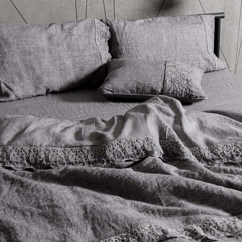Double duvet cover in gray linen with lace drops, handmade quality made in Italy.