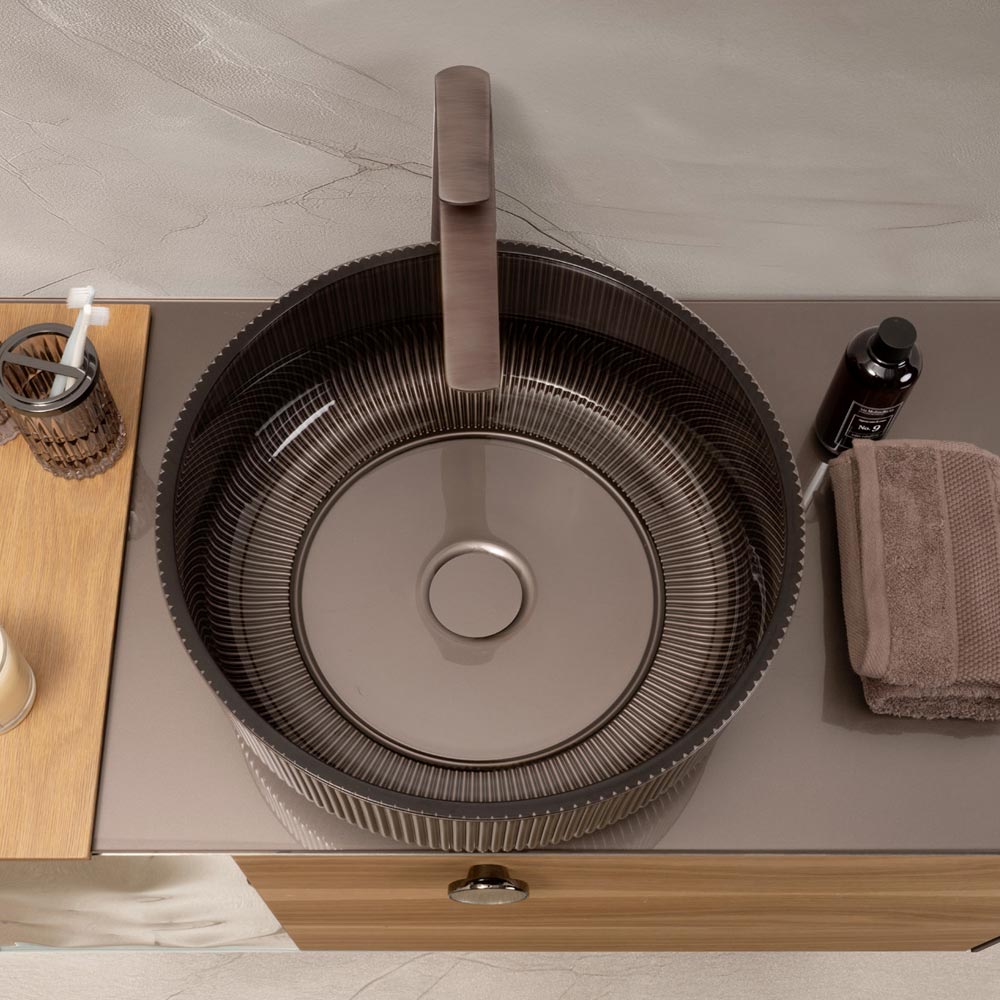 Available in sophisticated color versions , the sink adapts to both classic and contemporary settings, always lending an exclusive and refined character. The shades, combined with the natural brightness of the glass, lend depth and movement, transforming the sink into a truly decorative work of art.