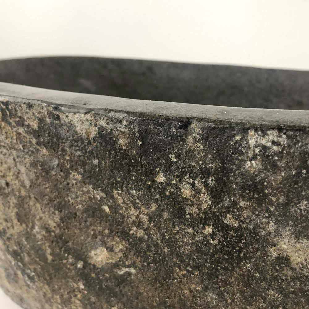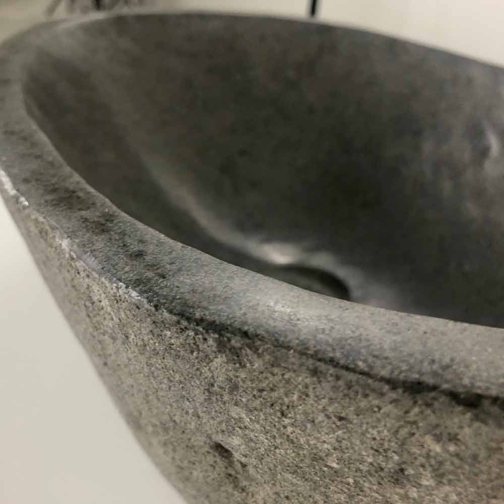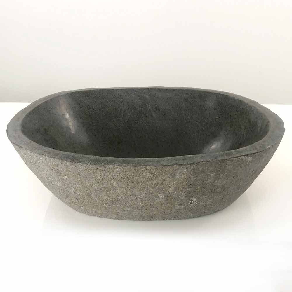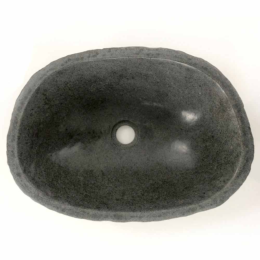 Akta model countertop washbasin in natural river stone, with an oval shape.