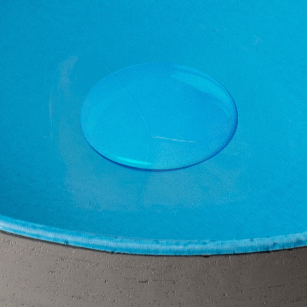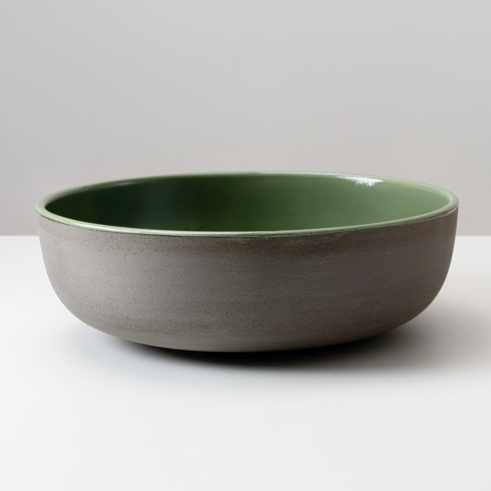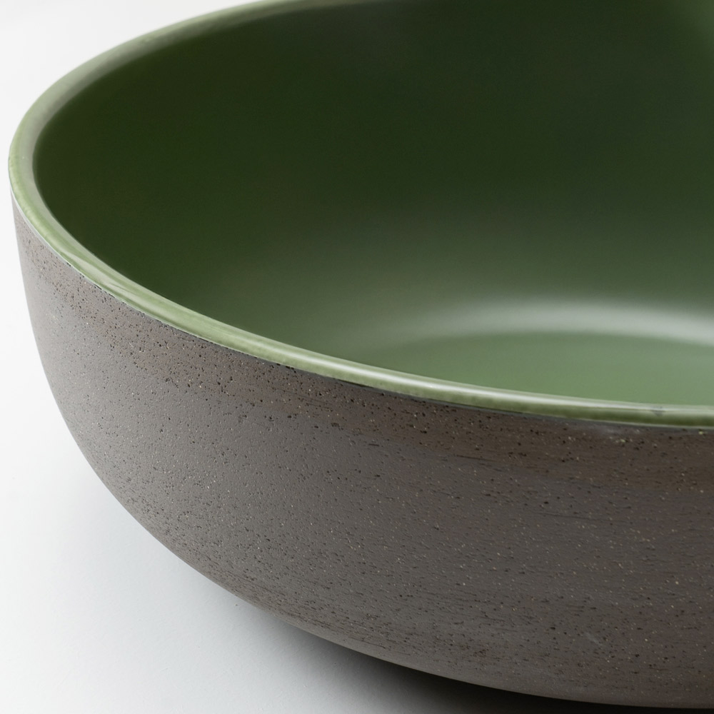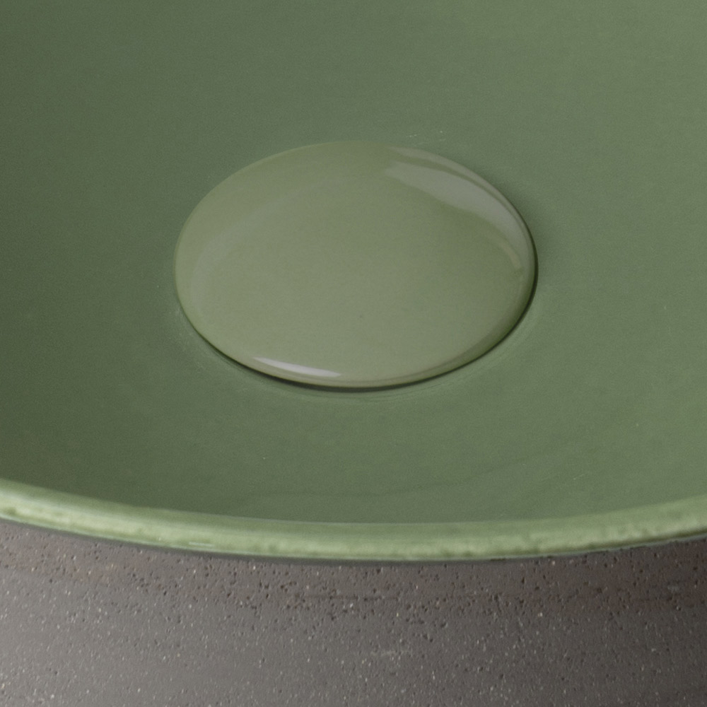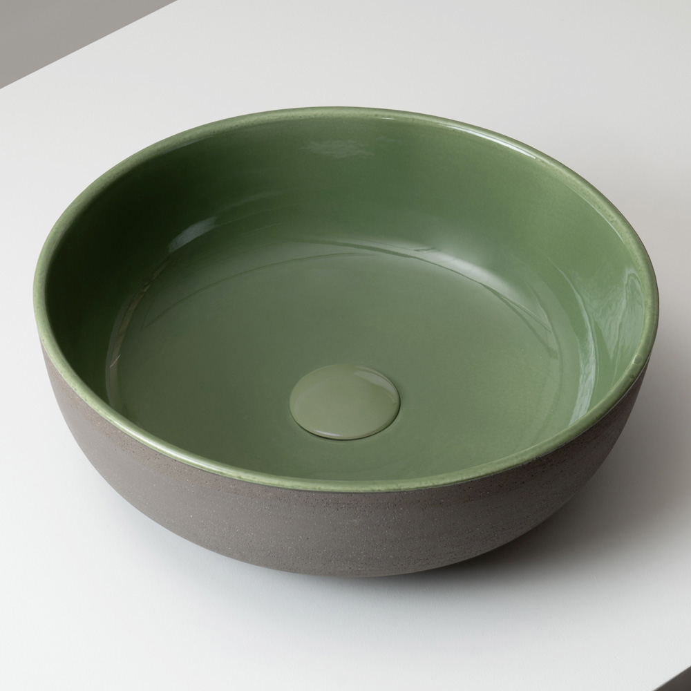 This countertop sink features a dark Raku exterior finish and stands out for its flared shape and the contrast between the internal vitreous enamels and the almost sanded-textured exterior surface. This material balance makes the sink a true design statement.