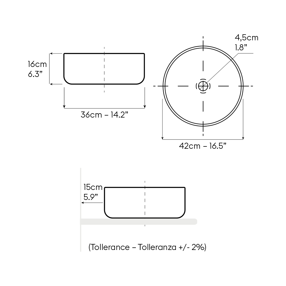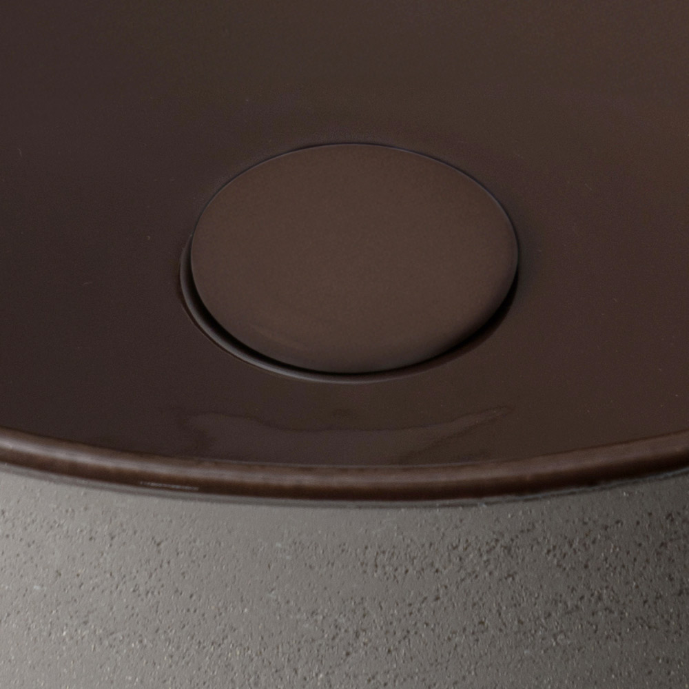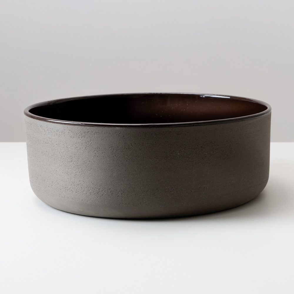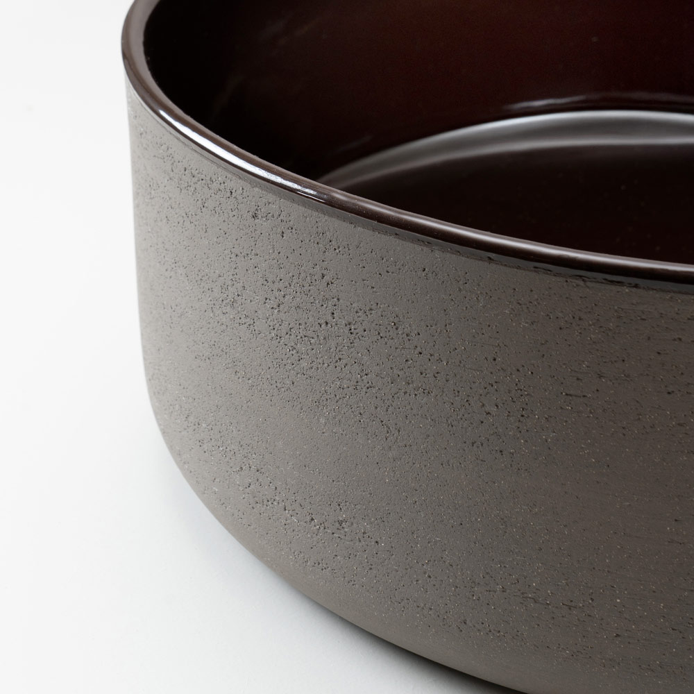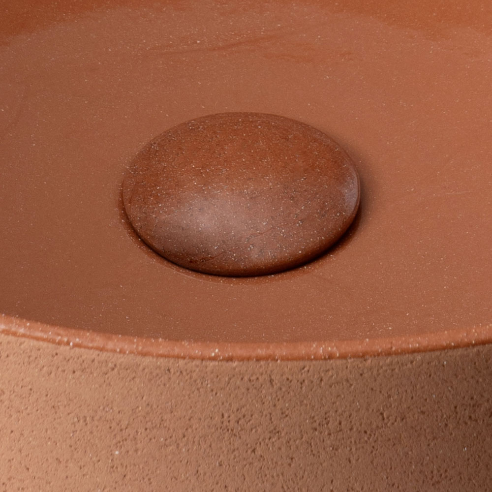 The countertop washbasin is made of natural earth and stands out for its simple shapes and the strong texture of its surface. A design piece that combines craftsmanship and aesthetic research, designed to enhance the bathroom with contemporary elegance.