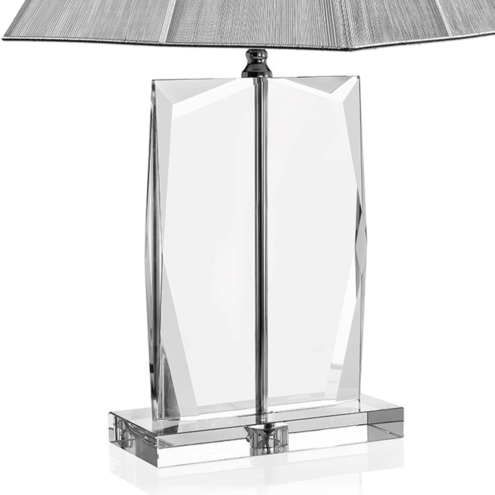 The table lamp has a charming and luster design with the base made of monumental precious crystal and a squarelampshade of silver threads.