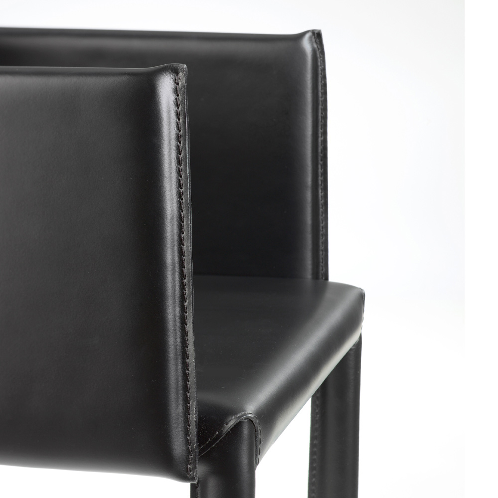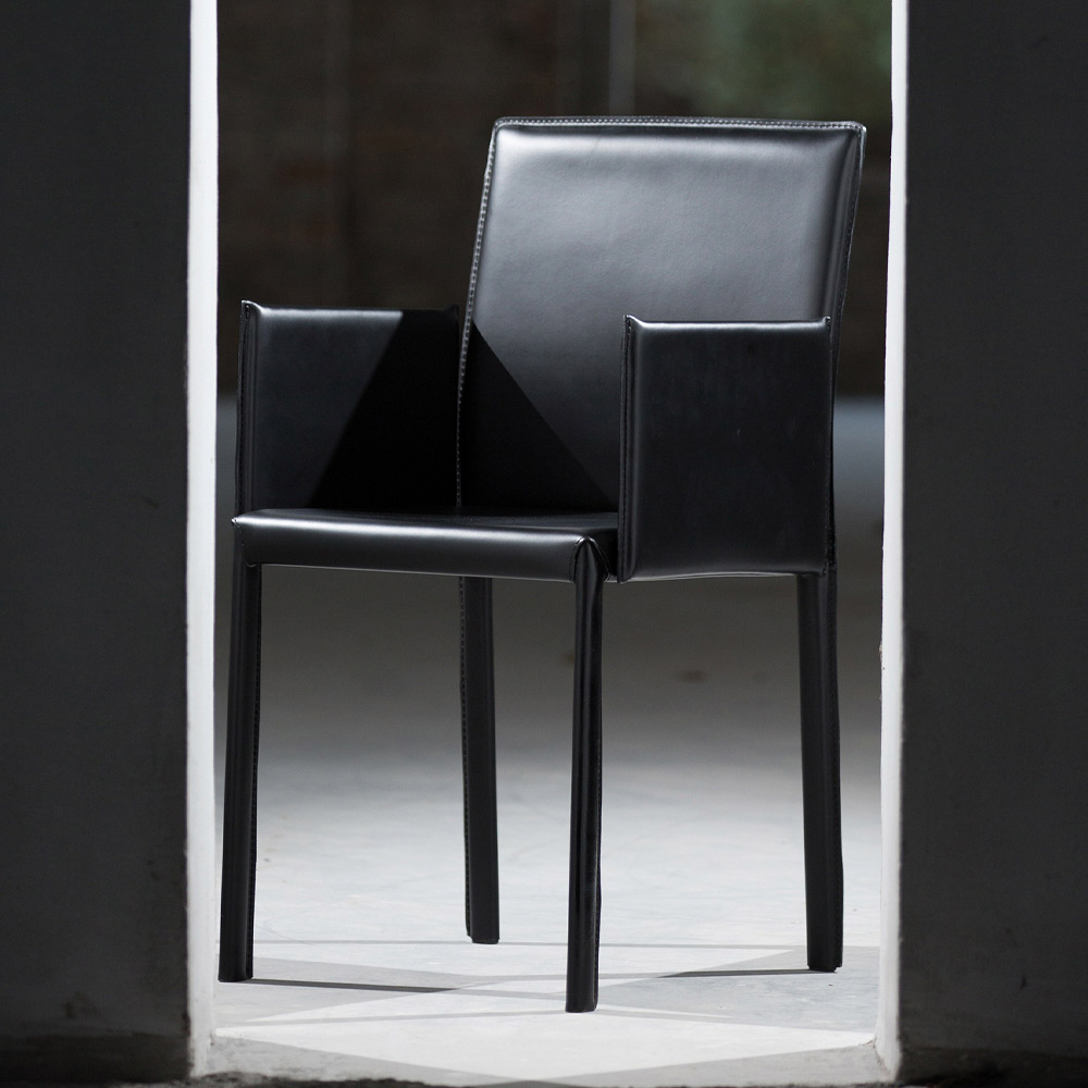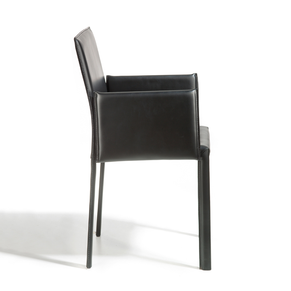 Dining chair with armrests , made entirely in Italy , completely covered in leather in the black finish . Structure with oval leg 30x15 mm. Thanks to its elegance and timeless charm , it gives character to the room and is perfect for furnishing your living rooms, dining rooms and kitchens with taste and style without sacrificing functionality and comfort.