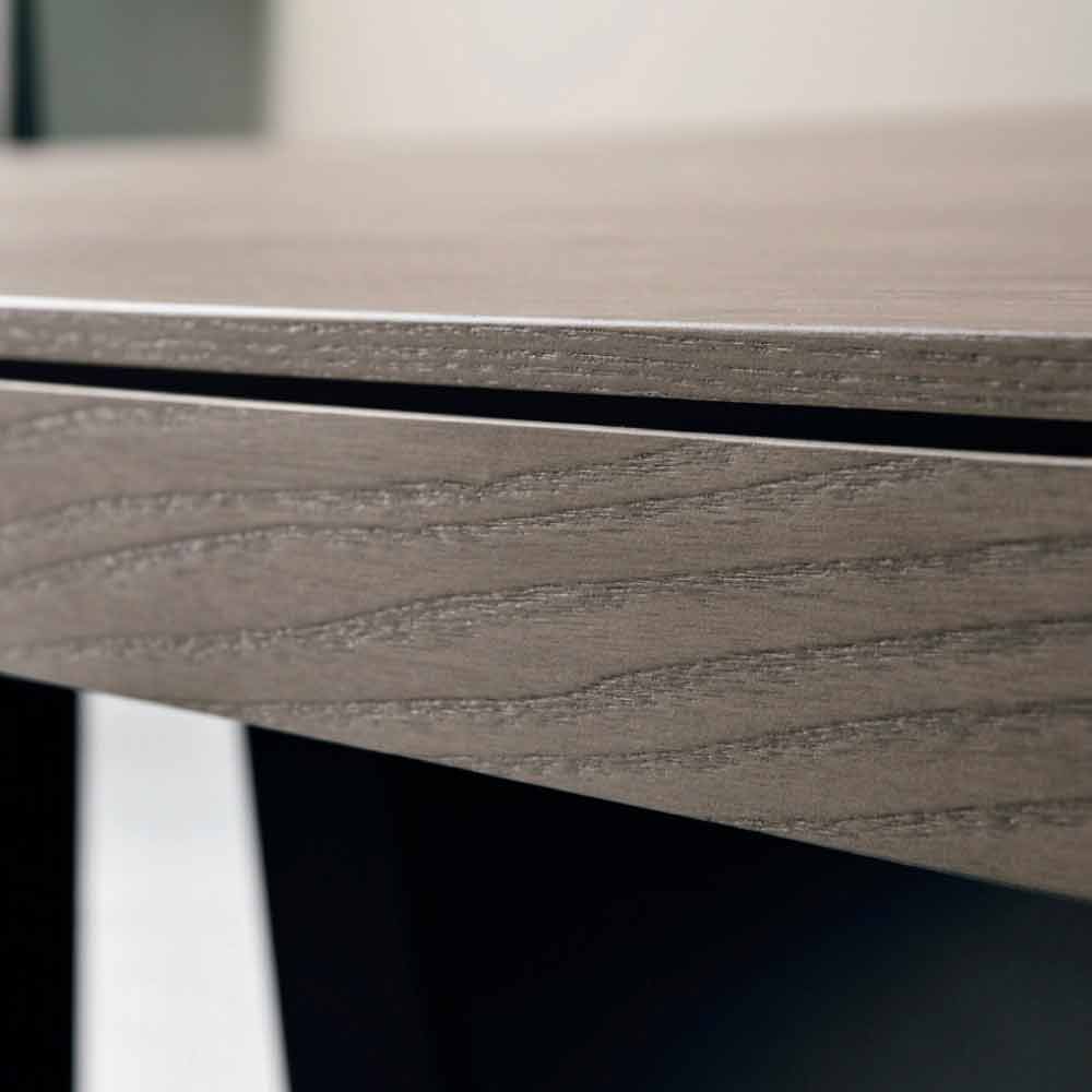 It has a structure of inclined panels (4mm thick) in micro-embossed anthracite finish metal ; inside it is complete with a painted anodized aluminum frame which houses three extensions of 45cm each. The top is made of knotted oak veneer with an inclined profile on two sides, 18+42mm thick and available in different finishes: