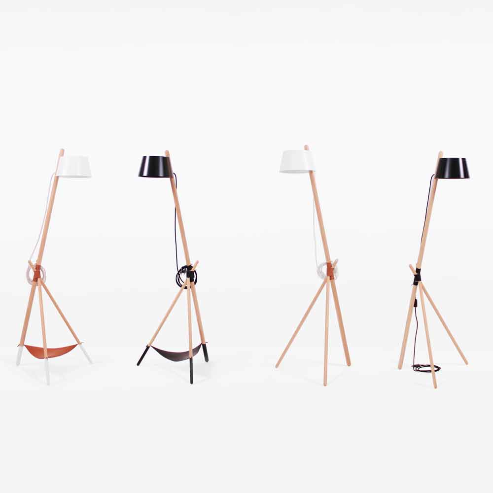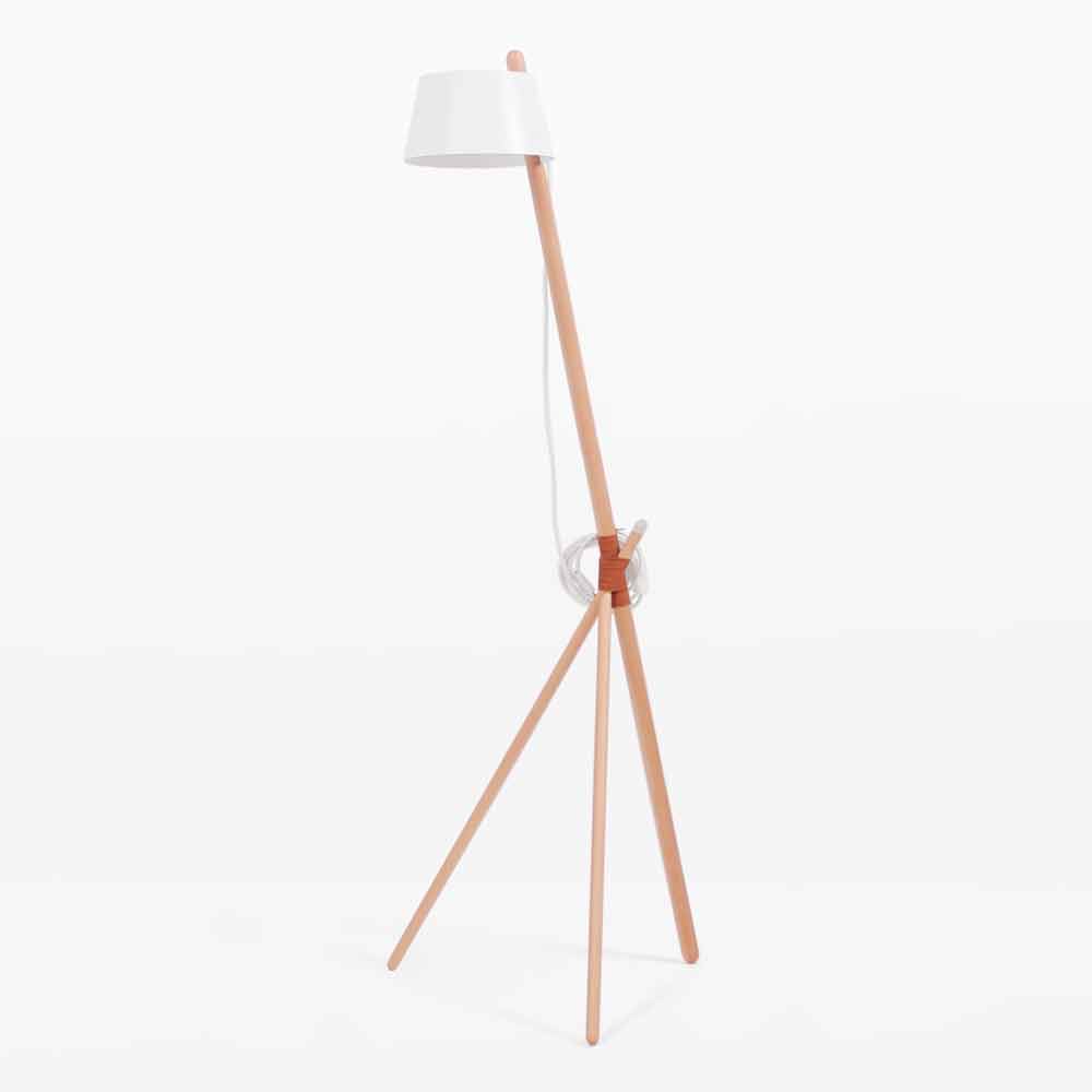 Modern design floor lamp in solid wood with vegan leather details.