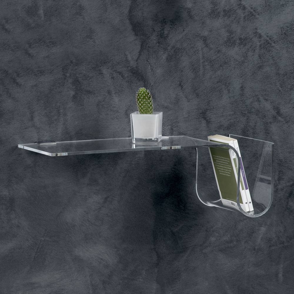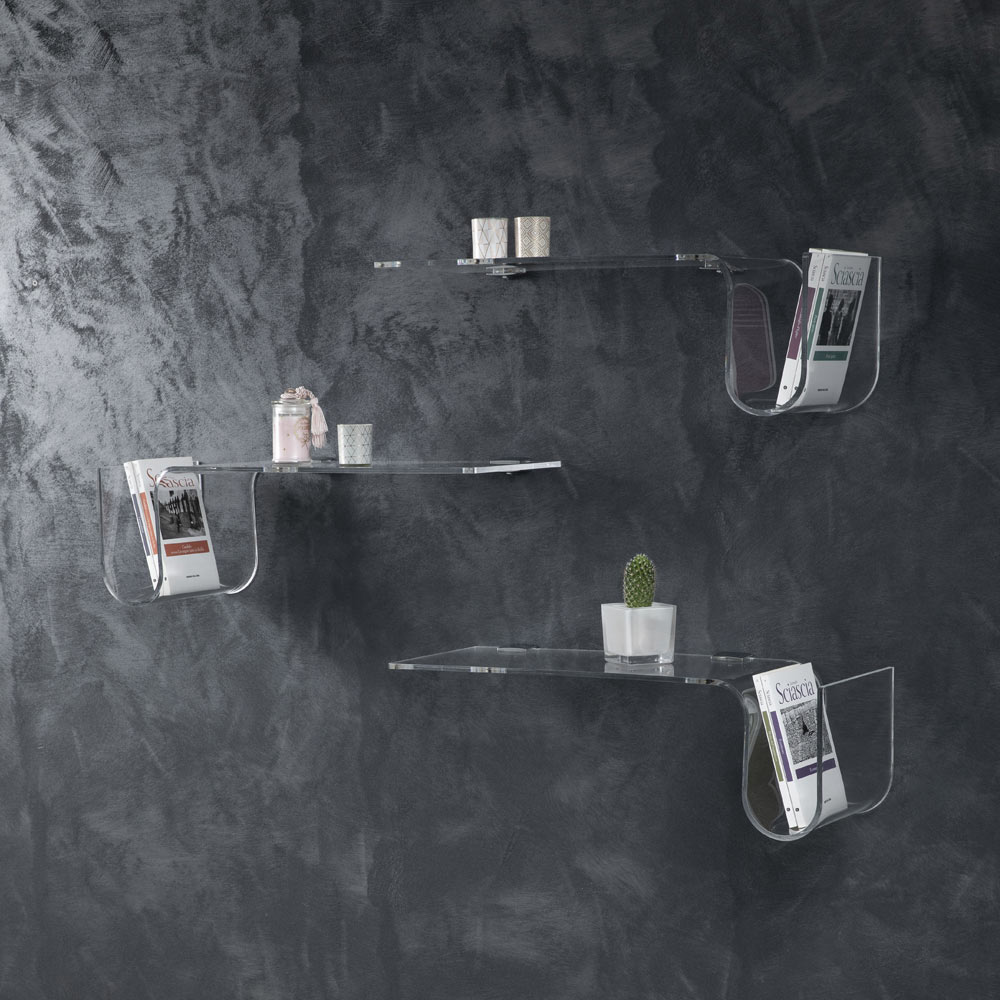 This wall shelf is made entirely of 8 mm thick transparent acrylic crystal , available in the right or left version. It is characterized by the curved side line ideal as a magazine rack. Thanks to the transparency and brilliance of the material, the piece of furniture seems to float suspended in the air.