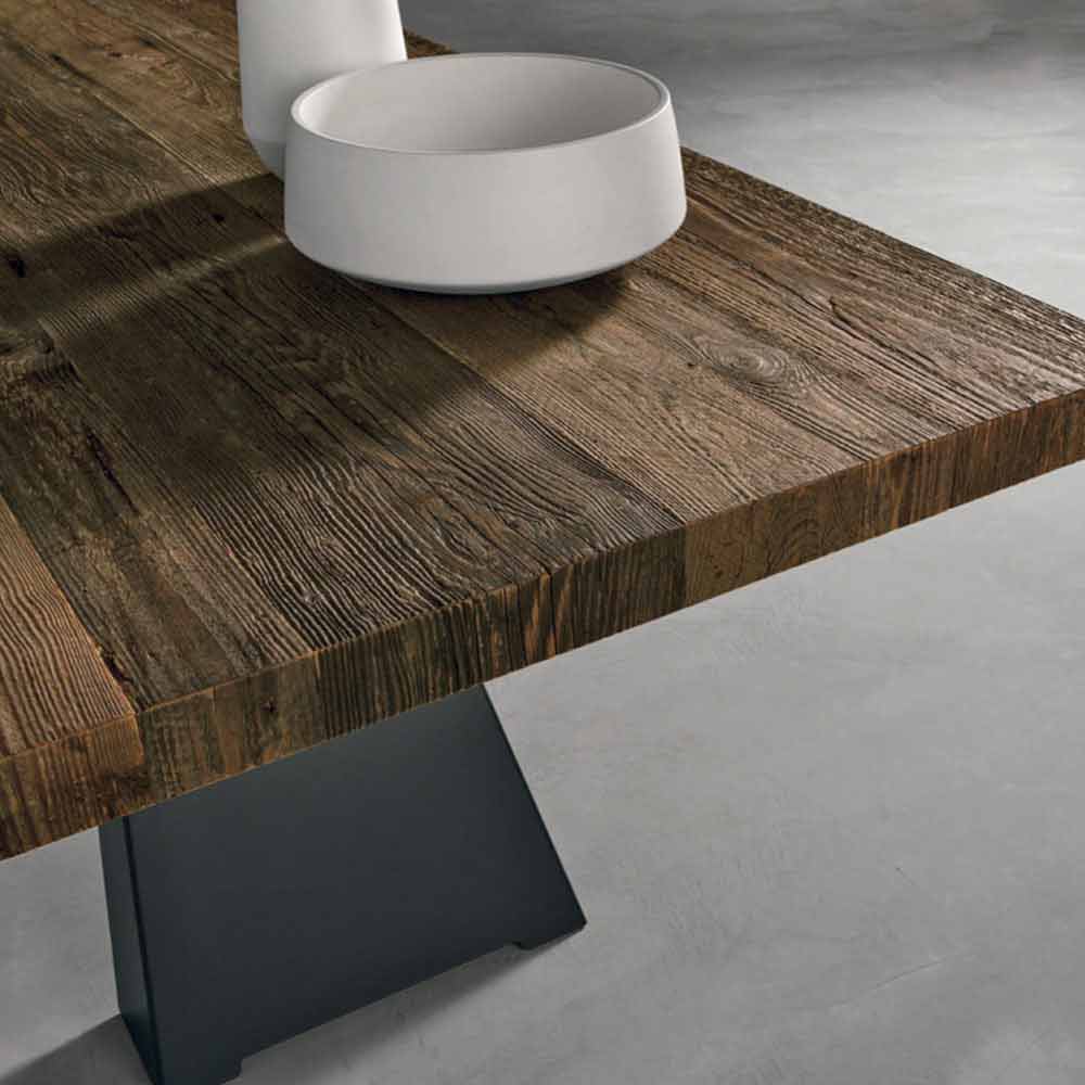 Designed and produced in Italy with a 60mm thick top in solid wood with a choice of fir or natural oak with folding processing. Its structure features inclined panels in micro-embossed anthracite metal .