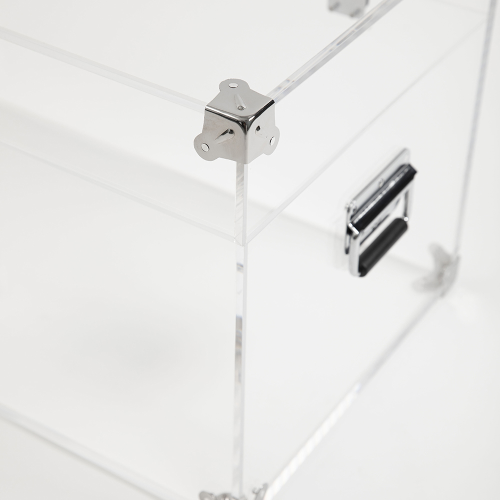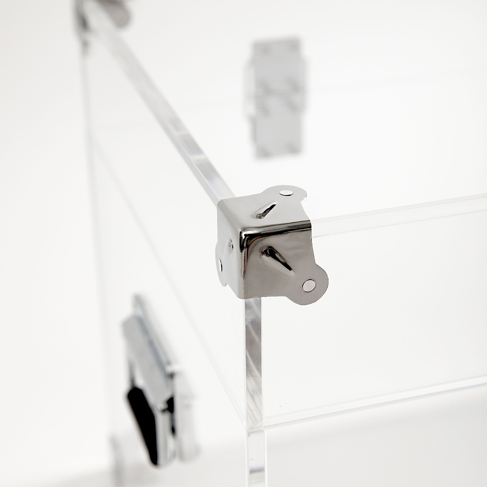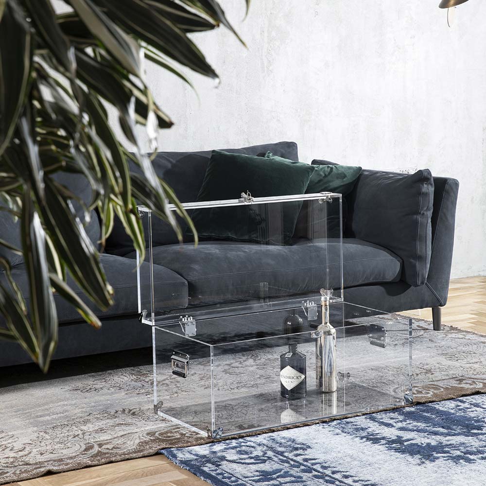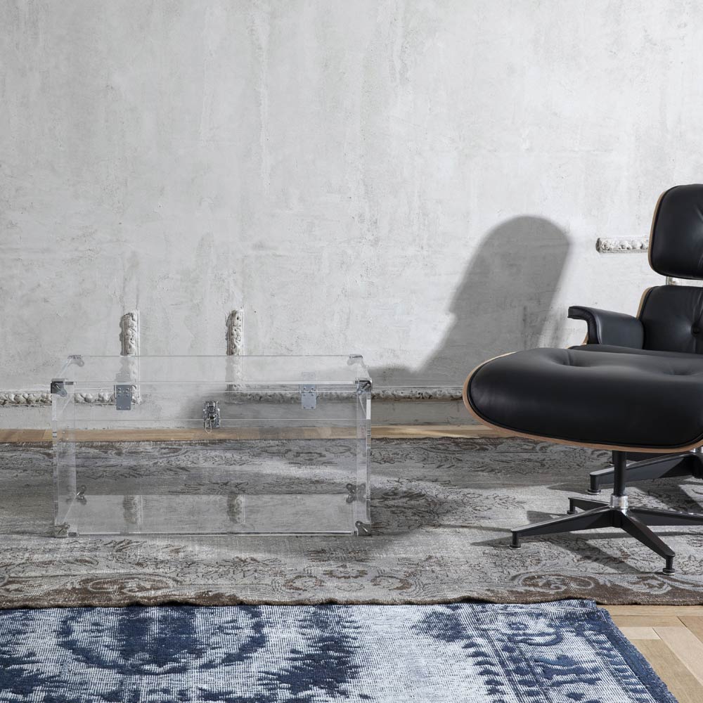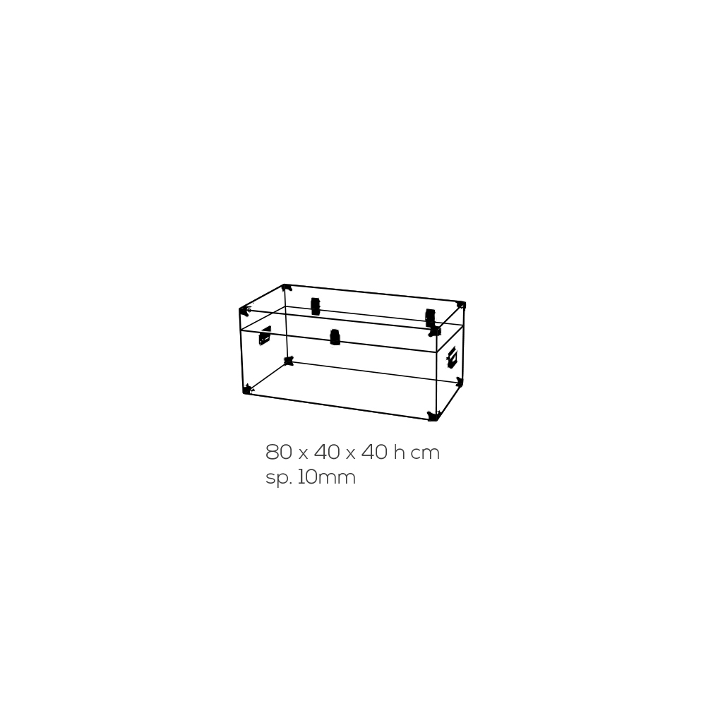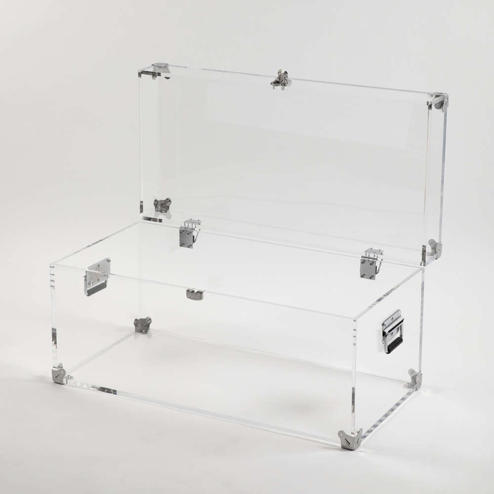 This trunk is entirely made of folded acrylic crystal available in 2 variants, entirely UV glued with precious chromed steel finishes. It is a piece of furniture that wants to be a conceptual reinterpretation of the typical vintage product that however it distorts its use through the use of a modern material that allows the contents to be shown inside, making it an unusual and fascinating protagonist of the environment.