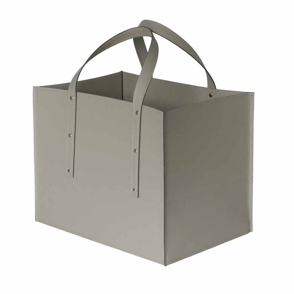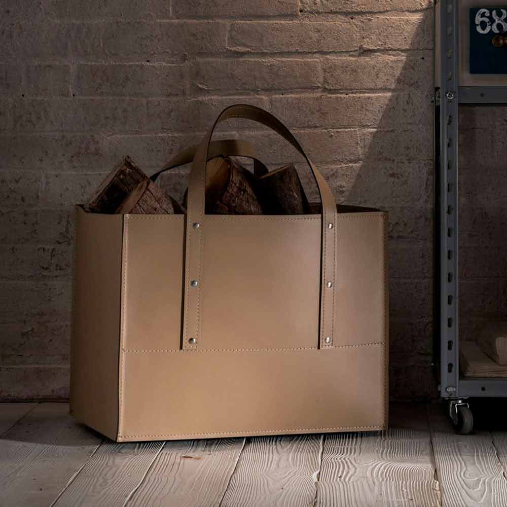 Design firewood holder in Maneghe leather, made in Italy Maneghe is a modern container for wood, made of regenerated leather inside and out, with a covered plywood bottom and rubber wheels.