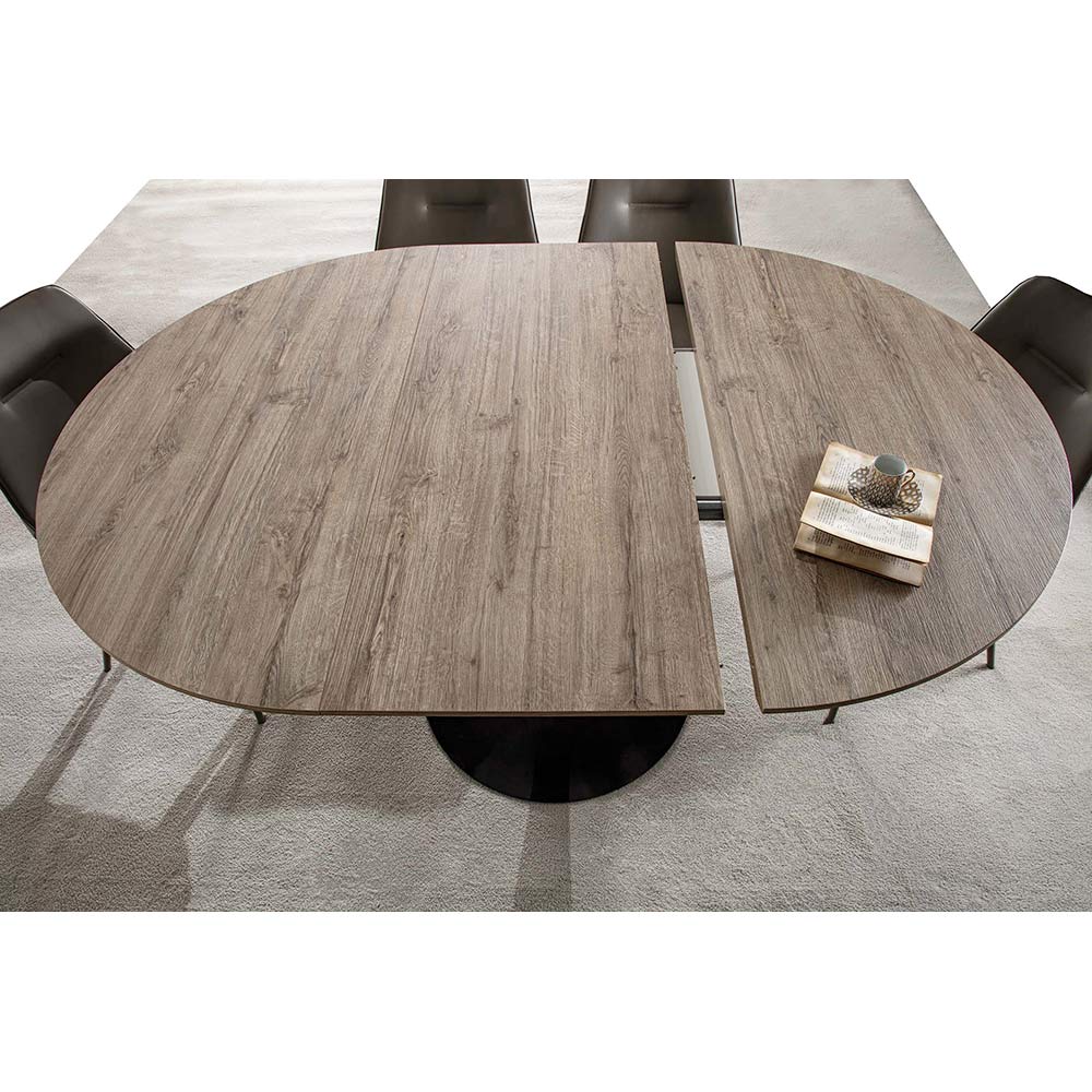 Wonderful dining table with round top in plated laminated wood (h 30 mm), textured oak finish with flared edge in mdf and base in black painted steel . What makes this table unique and particularly functional is the possibility of extending the top thanks to an external extension of 50 cm, thus obtaining a maximum length of 170 cm and allowing it to accommodate up to 8 people while ensuring a small table. that can optimize the spaces of your home once closed. Elegance and functionality are the keywords that best describe this modern piece of furniture that embodies an extremely contemporary look capable of enriching the aesthetics of the room by completing the furniture with sobriety.