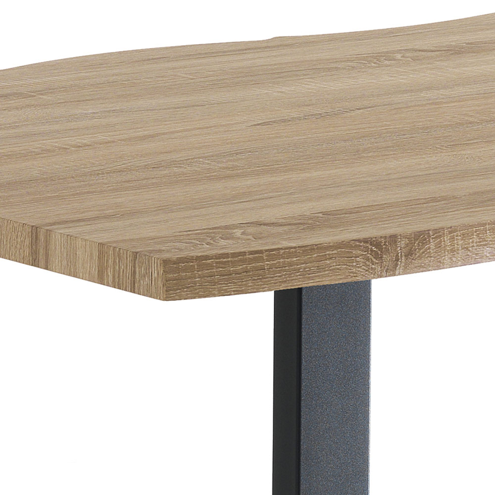 Dining table made of MDF covered in oak finish melamine (thickness 3.3cm) with matt black painted steel base. A product with a simple and versatile aesthetic characterized by the particular shape of the base which represents its real strong point. Ideal for those who love a minimal style that does not go unnoticed, this table offers a solid and resistant top as well as enriching the surrounding furniture thanks to its modern and elegant personality . The combination of chosen finishes completes the final look of the product, underlining its refined soul and exclusive design .