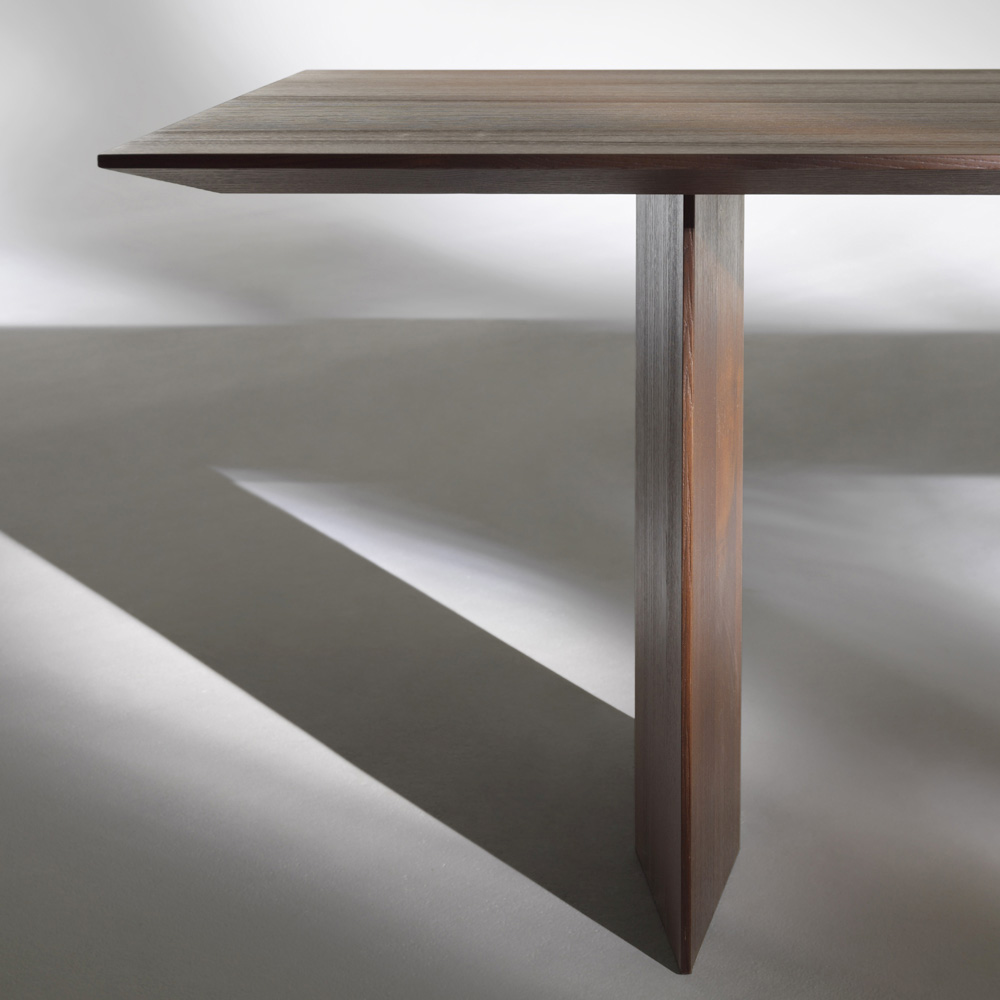 This designer dining table stands out for its essential and rigorous aesthetic, characterized by clean lines and balanced proportions. The wide, thin top appears suspended on two panel legs, creating a solid yet visually light composition, ideal for contemporary and refined spaces.