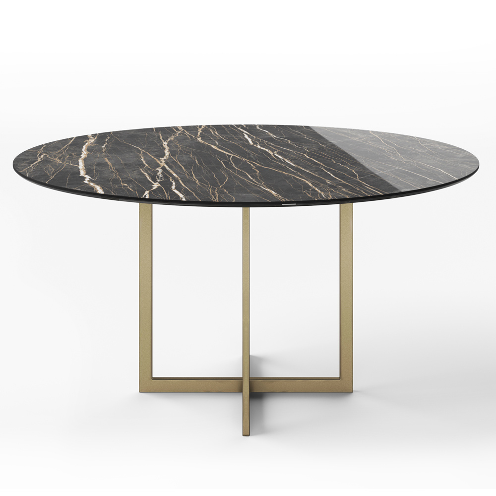 Dining room tablewith round top in polished marble effect porcelain stoneware supported by a lacquered glass (8mm thick) with 45 ° beveled edge and burnished brass finish metal structure, entirely made in Italy . Its aesthetics stems from concepts of freedom and creativity as it offers the possibility to choose from a wide range of different finishes capable of enriching the environment with personality and refinement. Design and innovation distinguish each element of this wonderful and elegant piece of furniture characterized by the great attention to detail and the high quality of the materials chosen for its production.