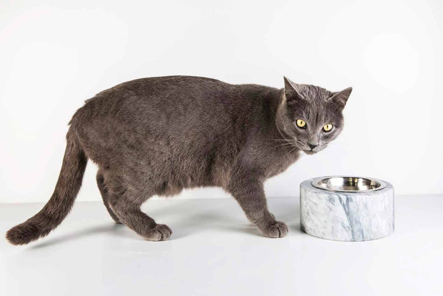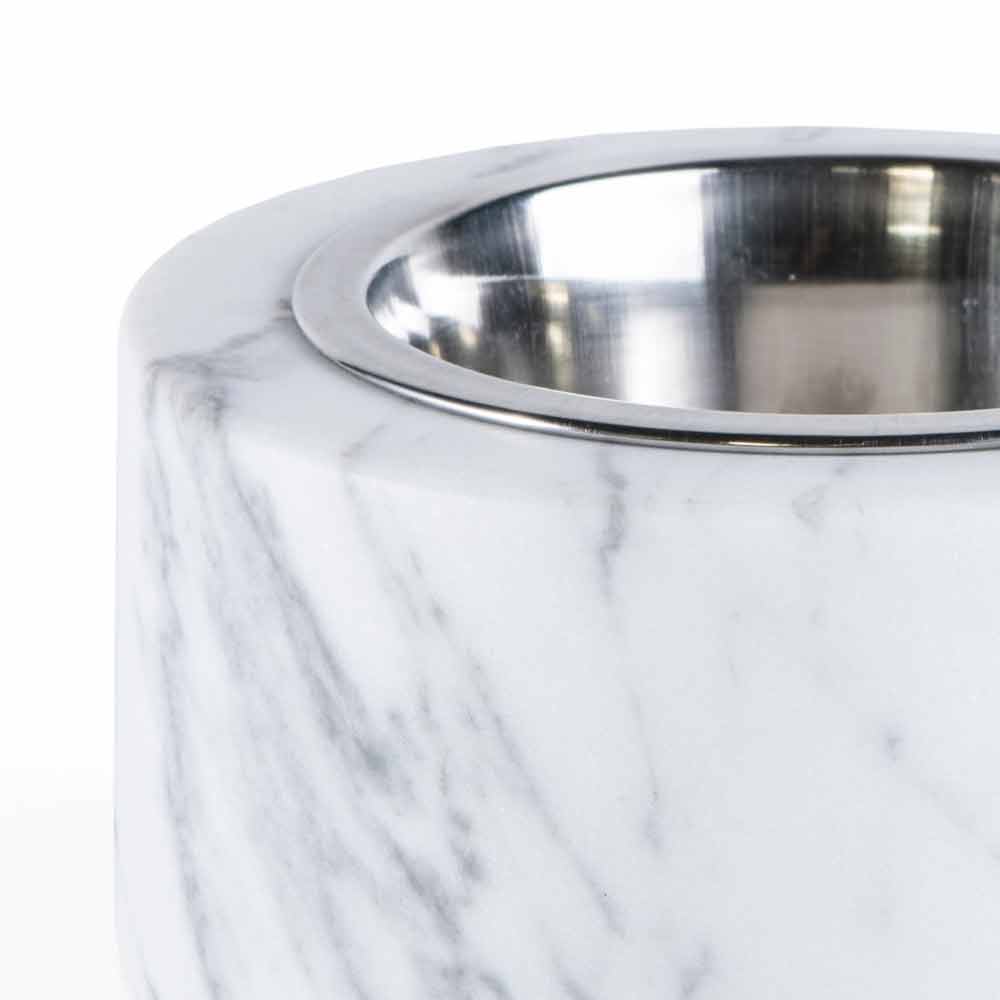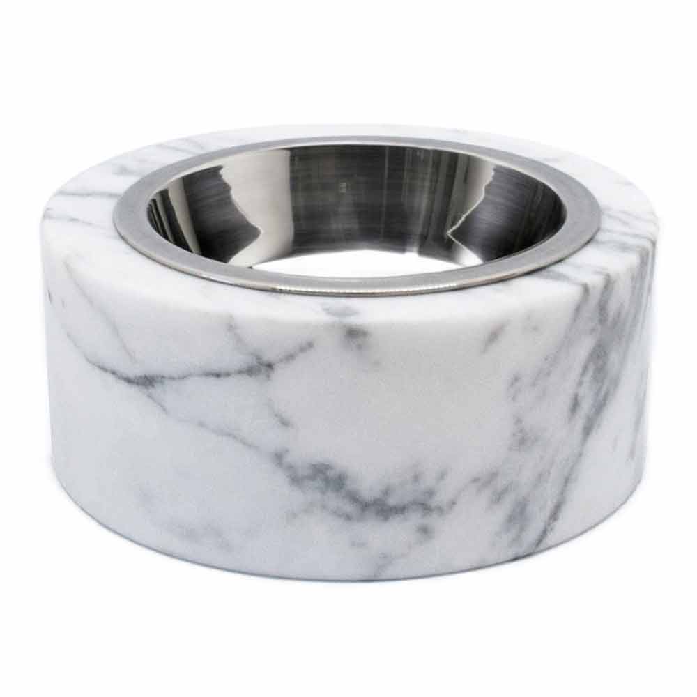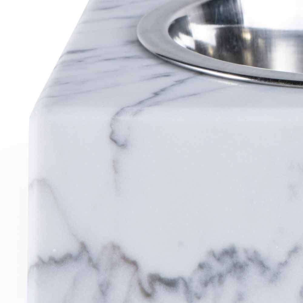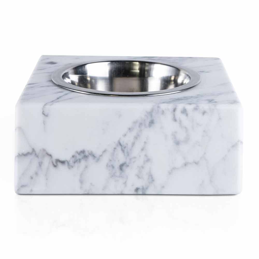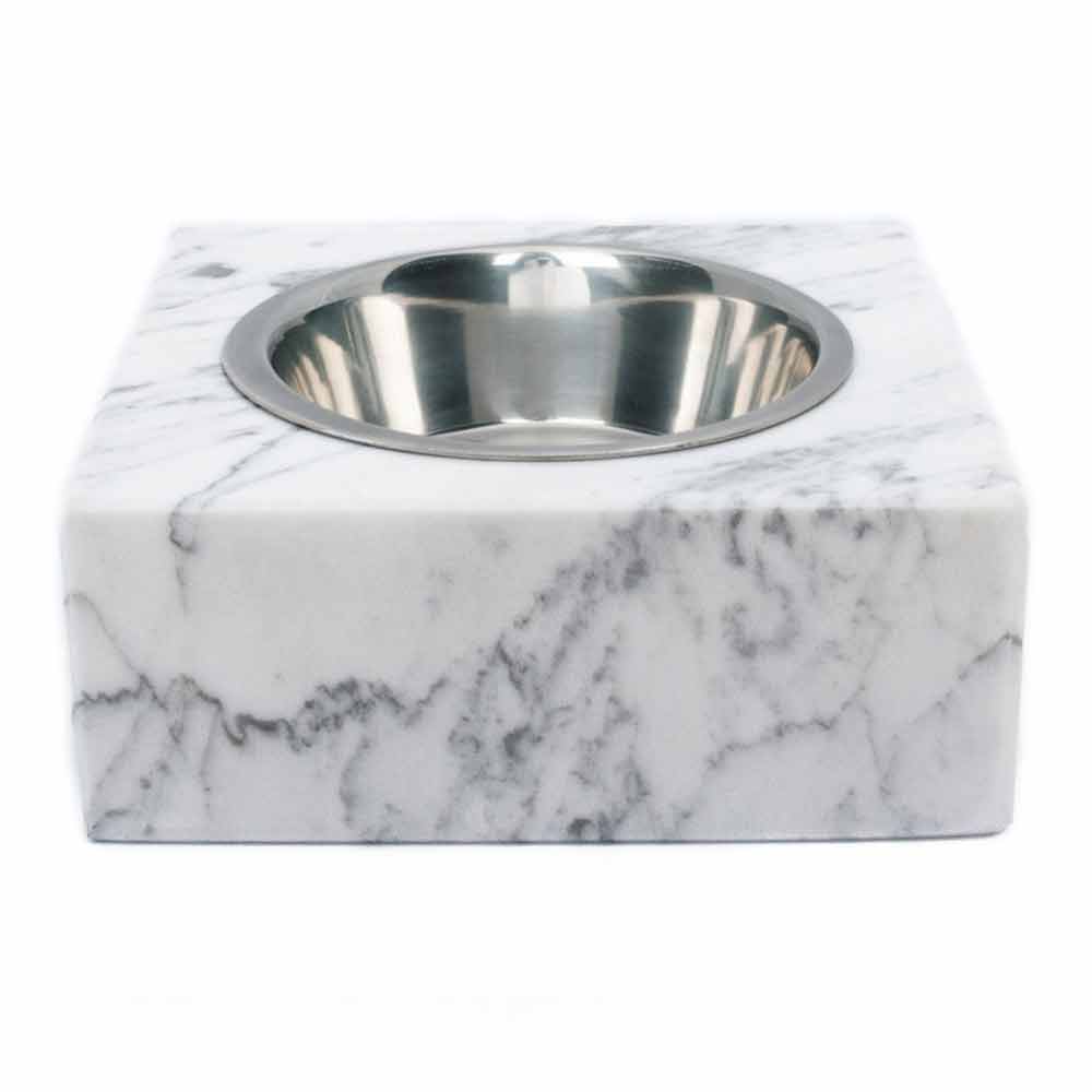 Bowl for dogs and cats characterized by the white Carrara marble of which it is composed. It is a unique piece as each block of marble used differs from the others for veins and shades.
