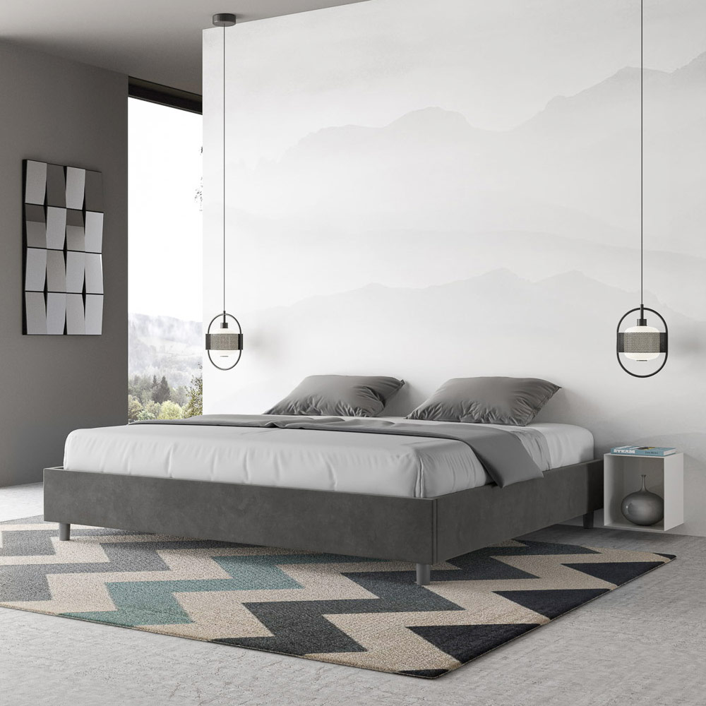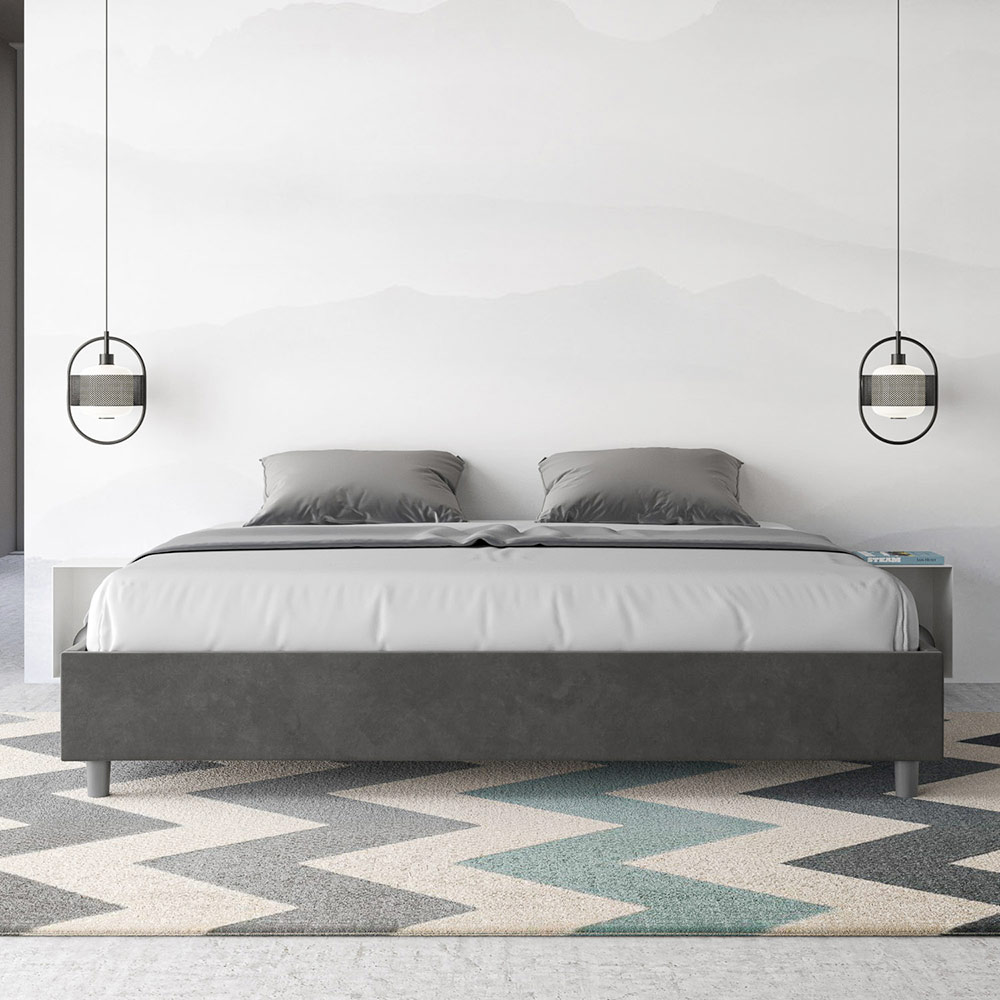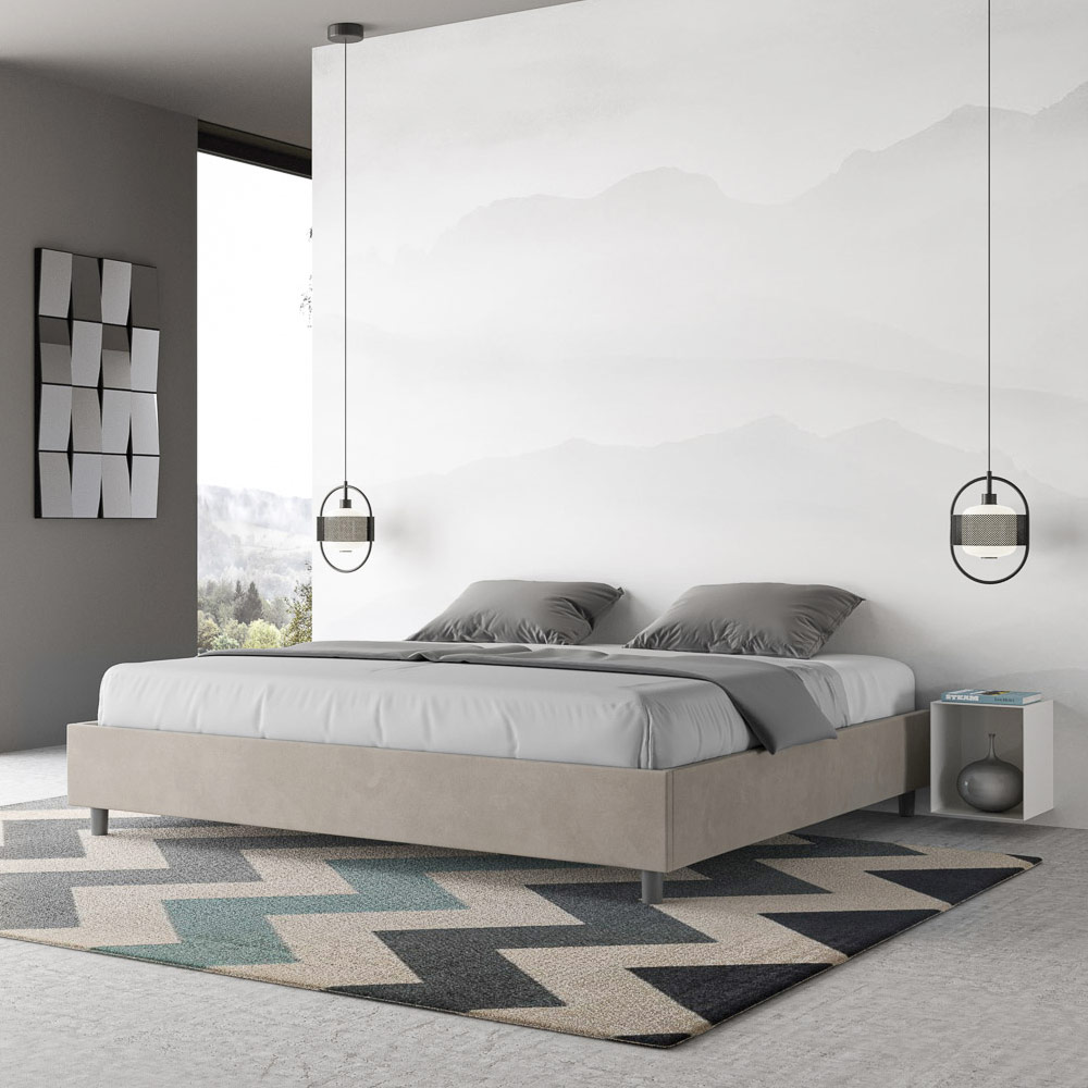 King size bed 180x200 cm padded made of melamine panels and covered in microfibre , entirely Made in Italy. This king-size bed stands out for its clean, minimalist design . Its understated aesthetic and versatility make it easy to integrate into any setting. One of its defining features is the absence of a traditional headboard , making it ideal for placement in unique spaces, such as under a window, in an attic, or near a decorative wall, without obstructing the view or achieving the desired effect.