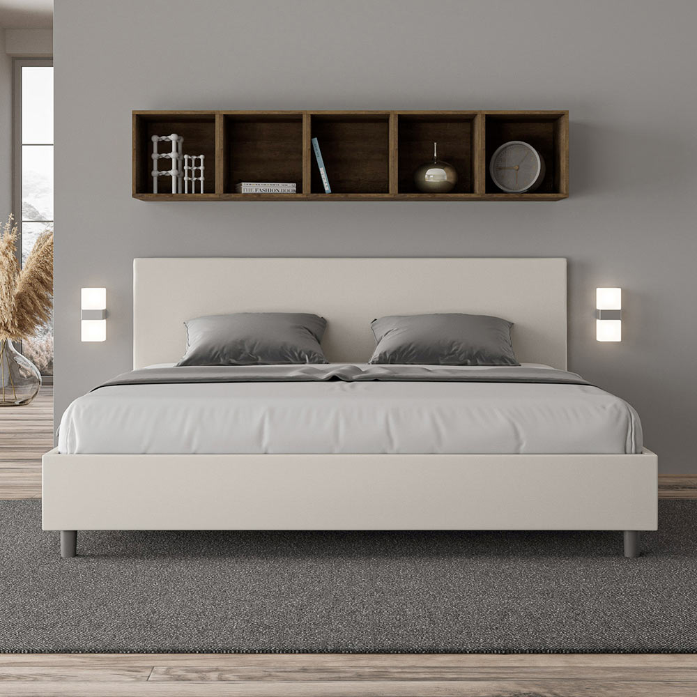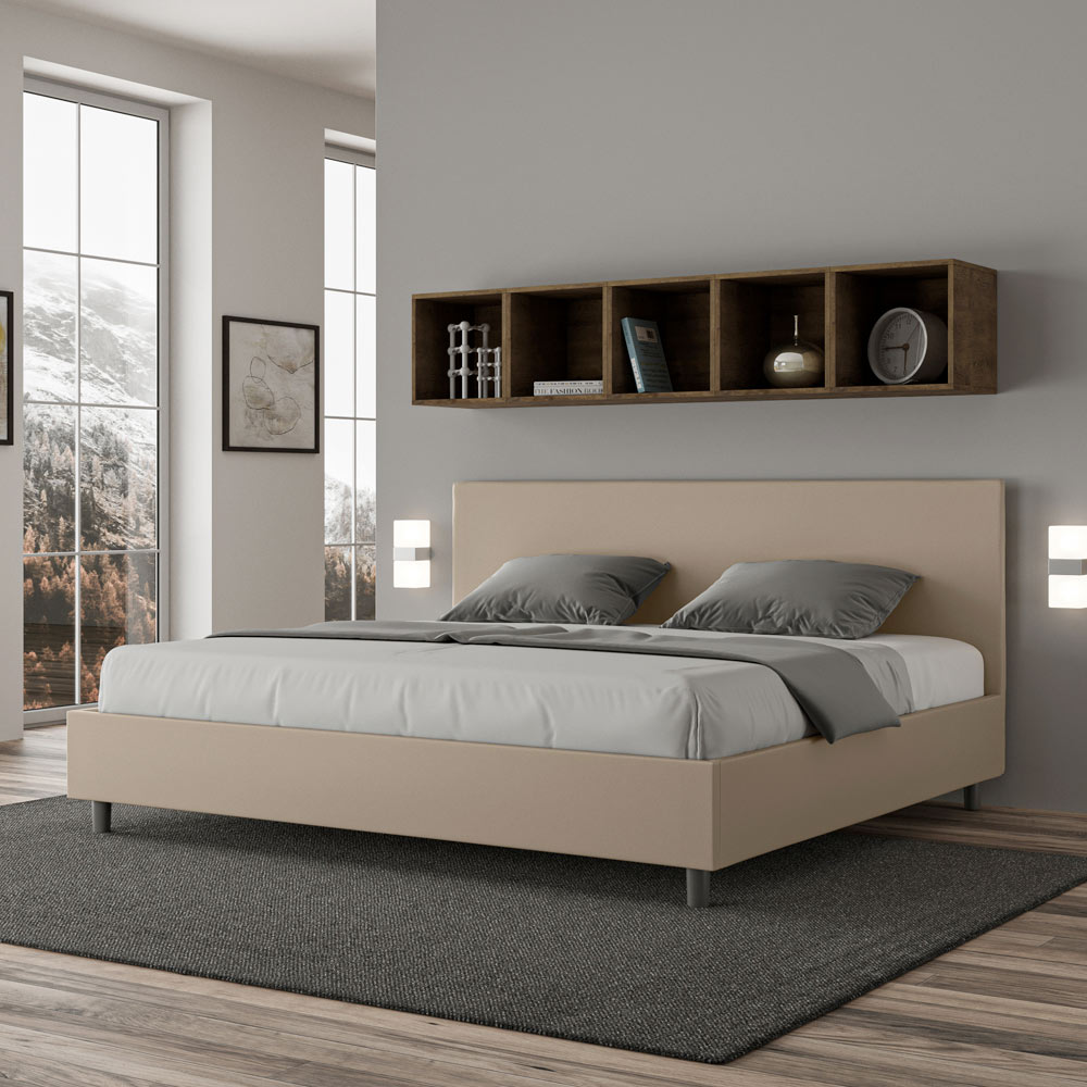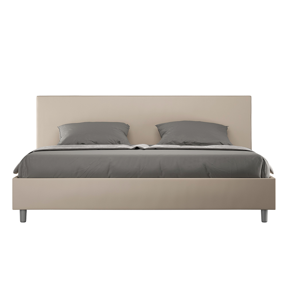 King size bed 180x200 cm padded made of melamine panels and covered in imitation leather , entirely Made in Italy. This king-size bed features a padded bed frame and is an icon of understated yet elegant style. Featuring a faux leather headboard , this bed blends seamlessly into any space, adding a distinctive touch of class and luxury, quintessentially Italian. Maintenance is easy: simply wipe it with a microfiber cloth to preserve its beauty over time.
