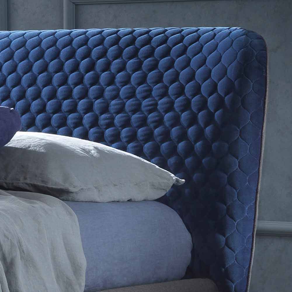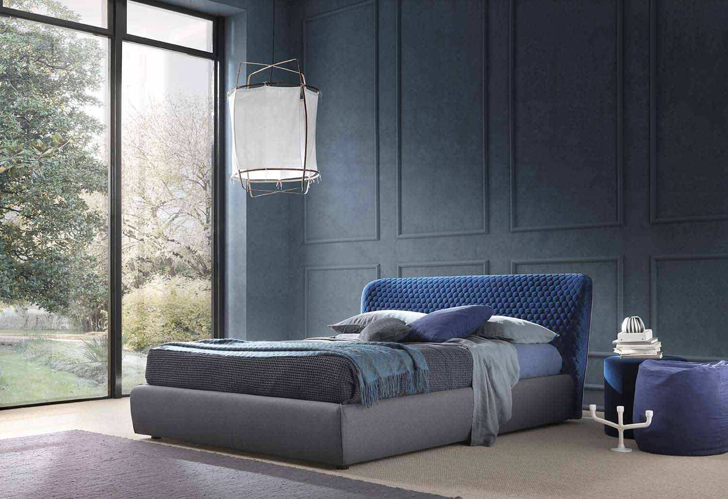 Double bed with container, Corolle by Bolzan The Corolle double bed with a contemporary design, has a sinuous line intertwined with an accurate choice of colors. Soft lines, which we also find in the texture of the headboard. The container has a structure in wood agglomerate with a synthetic internal finish with a fir effect, the latter are supported by profiles of expanded polyurethane and tubular It is completely removable. The structure is made of fir wood strips with a natural internal finish h.29, and is covered in polyurethane foam without chlorofluorocarbons according to UNI standards and lined with light-stable velfodera. The bottoms of the structure are in wood agglomerate with a synthetic internal finish with a fir effect, the latter are supported by PE and tubular profiles. The internal height of the box is 18 centimetres. Slatted base with metal structure, curved frame with 50x37 mm profile painted with epoxy powders. Normal orthopedic slatted base, curved beech plywood slats Vase feet h.4 cm