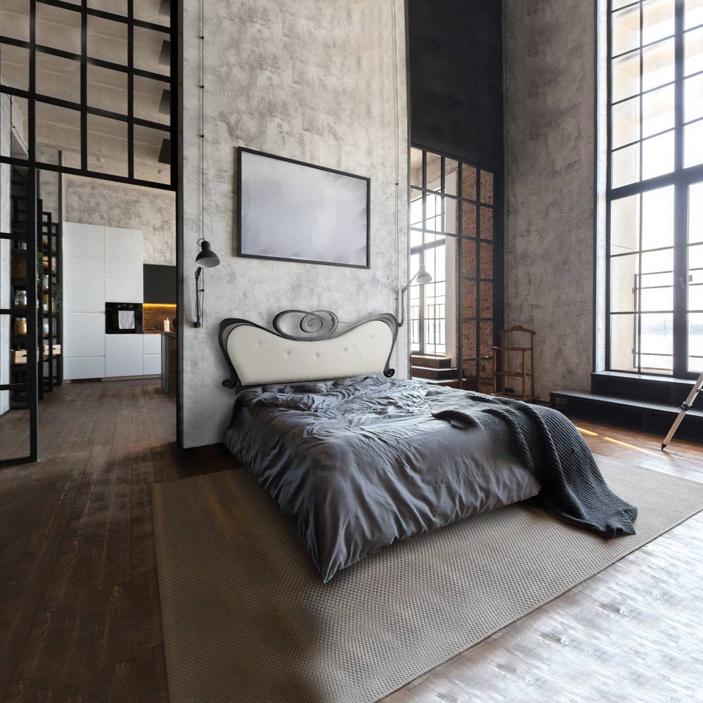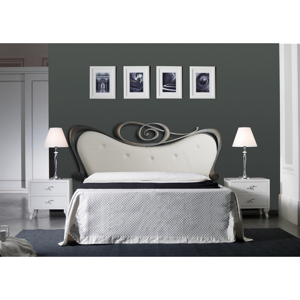 Double bed made with headboard and bed frame in 90% solid iron and 10%tubular iron with snow white real leather padding and powder-coated finish. Bed with soft and curved profiles that give a visual effect and lightness to the room. This product can be inserted into any furnishing style, responding to different design, functionality and quality needs.