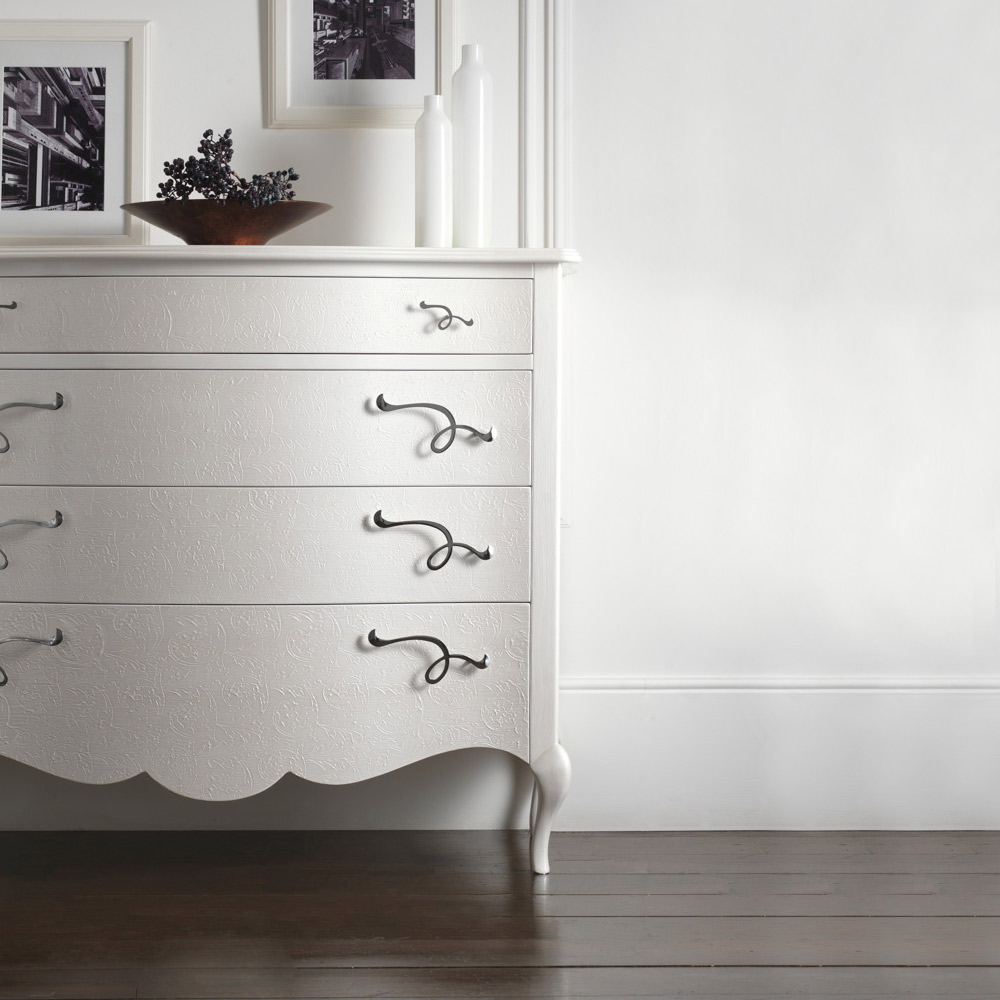Dresser made of Linden blockboard with artisanal mother-of-pearl finish, composed of 4 drawers with chromed handles. Expert Italian craftsmen have taken care of every detail and selected the materials to guarantee the quality of Made in Italy . Soft, sinuous lines and fine finishes create elements that complete and give a unique touch to the environment, offering customers great capacity and functionality.