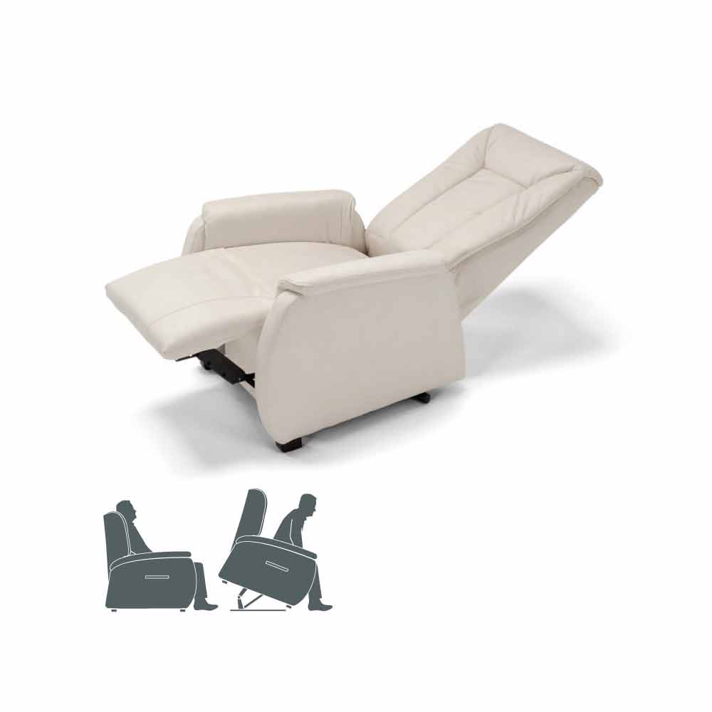 The Rosa design armchair has a two-motor mechanism capable of generating the autonomous movement of the backrest with respect to the footrest. This mechanism, through an independent selection of the two movements, allows to obtain different combinations of relaxation. In addition to the functions of the relaxation mechanism, this mechanism includes a lifting device that allows people with mobility difficulties to easily assume an upright position. During the lifting phase, the chair lifts up to the ground by 10cm.