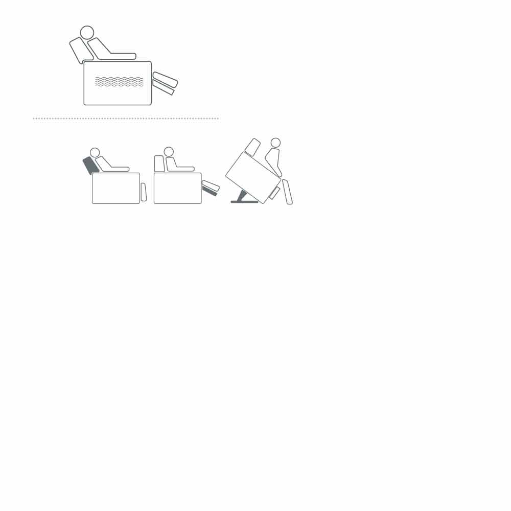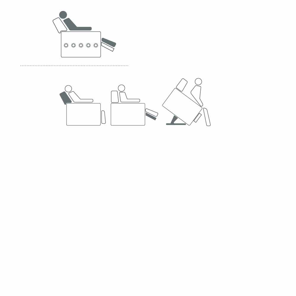 Mechanisms with one or two motors , alternately autonomous or independent foot and backrest movements, lift function , lifting device that allows you to easily assume the upright position, vibromassage for a pleasant effect distributed on the backrest, seat and footboard, automatic or motorized movement, are these are the possibilities and combinations developed: a harmonious set of solutions to satisfy every type of need.