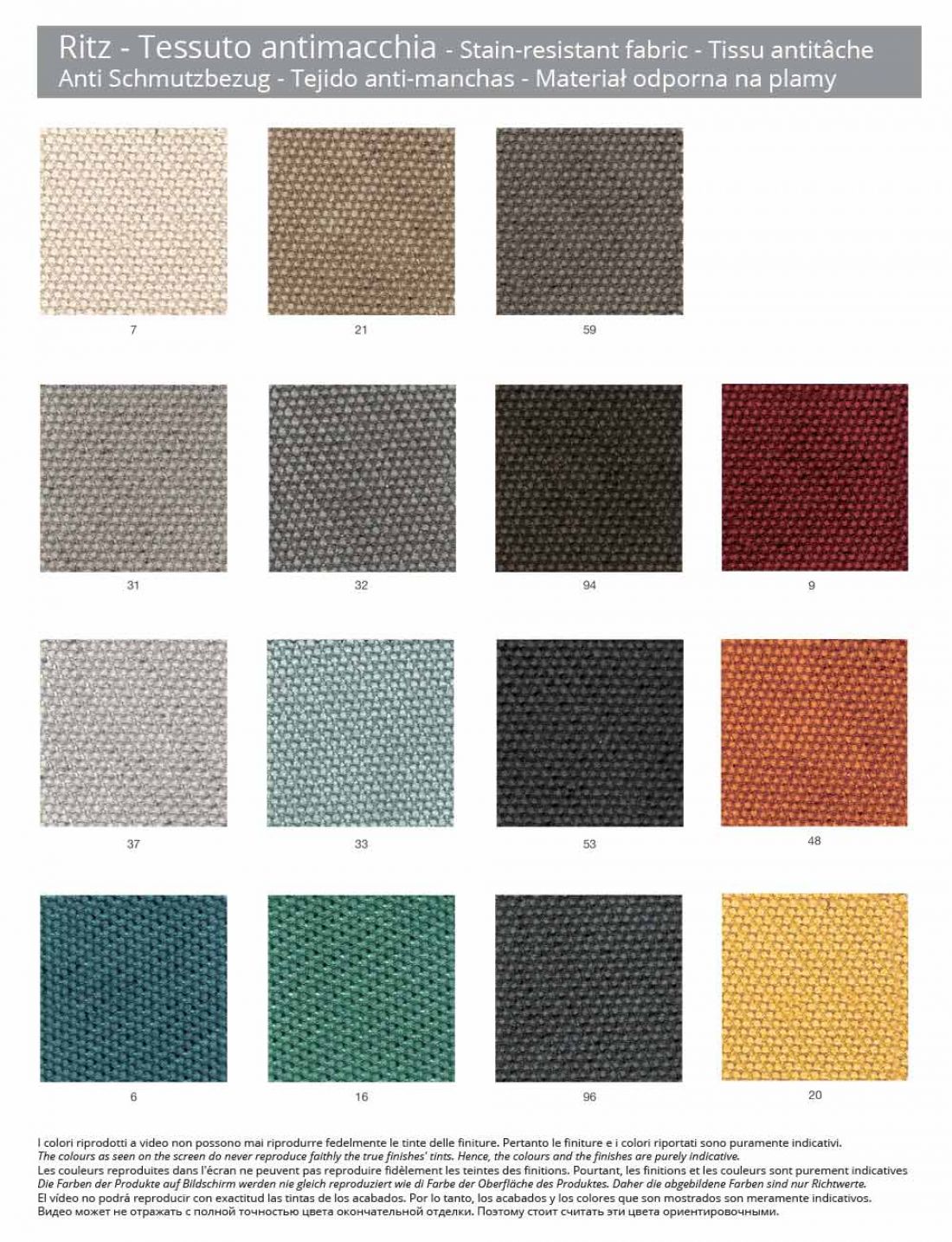 - Ritz stain-resistant fabric ; Ritz is a pleasant to the touch fabric, selected as a covering for these armchairs thanks to its characteristic resistance to wear. It is a stain-resistant fabric composed of 86% Polyester, 14% Polyamide. Weight / thickness 490 gr / mtl.
