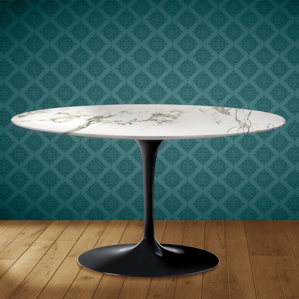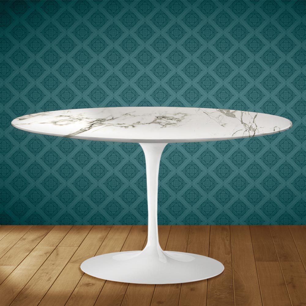 Coffee table with an oval top in Aura 22 ceramic, a matte Carrara Statuario marble effect , and a polished aluminum base, entirely made in Italy . This furnishing accessory has two unique features: the Aura 22 ceramic and its oval shape. The ceramic is distinguished by its complex and highly refined graphics , which create a warm and welcoming atmosphere in any living space. This material is also high- quality and highly durable . The distinctive oval shape is increasingly popular for furnishing rooms with originality thanks to its sleek lines and its practicality and functionality.