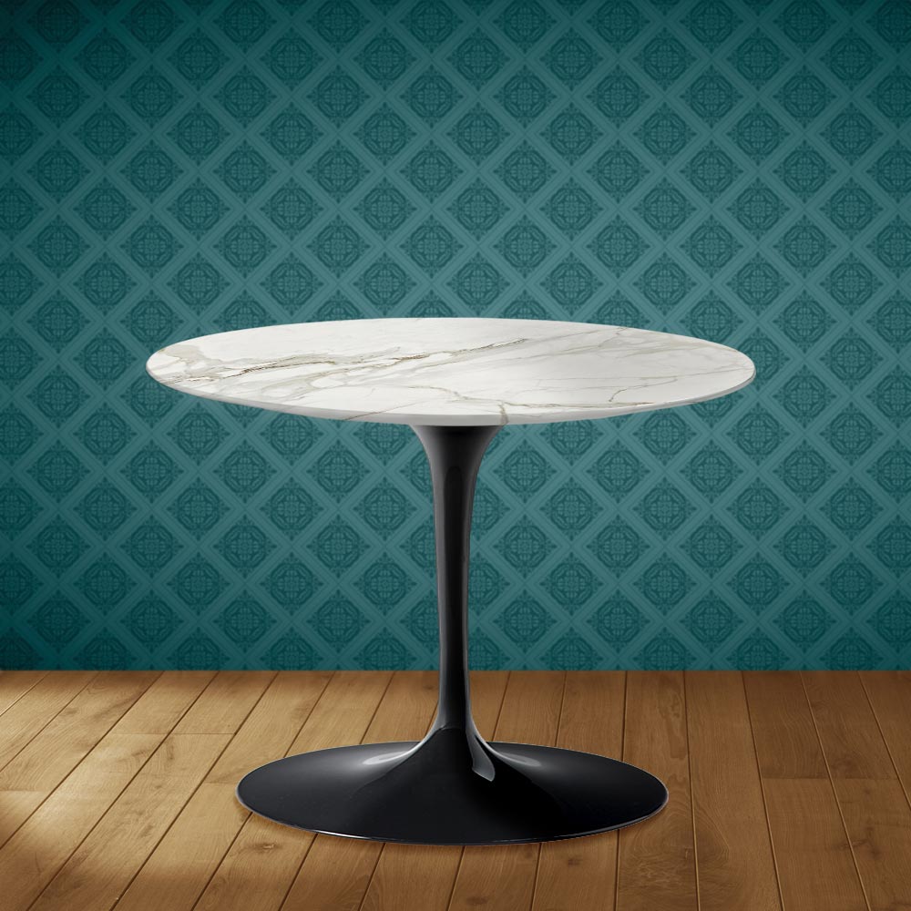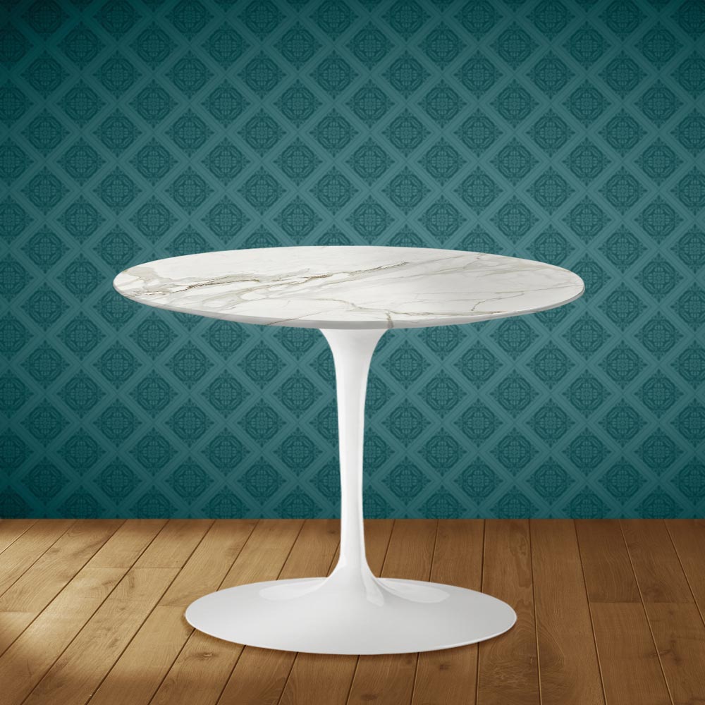 Coffee table with a round polished ceramic top, glossy Calacatta marble effect , and a polished aluminum base, entirely made in Italy . This piece of furniture, thanks to its simple and refined finishes , can be placed in living rooms furnished in a variety of styles. The main feature that distinguishes it from similar products is the top material, polished ceramic, an excellent ally for making the environment more welcoming and pleasant thanks to its exquisite graphics . Furthermore, the combination of ceramic and polished aluminum creates a perfect combination that makes this coffee table suitable for all occasions.
