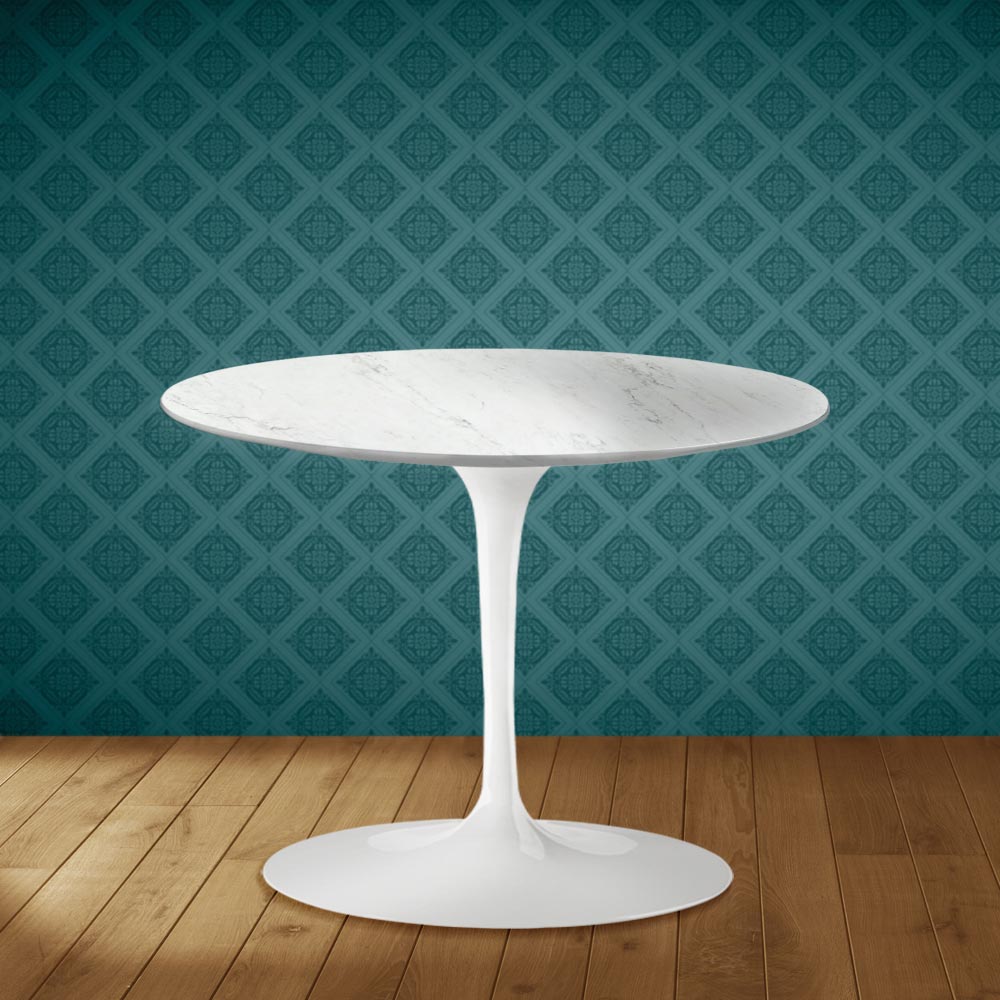 Coffee table with a round Salina ceramic top, glossy Carrara marble effect , and a polished aluminum base, entirely made in Italy . This piece of furniture, thanks to its simple and refined finishes , can be placed in living rooms furnished in a variety of styles. The main feature that distinguishes it from similar products is the top material, Salina ceramic, an excellent ally for making the environment more welcoming and pleasant thanks to its exquisite graphics . Furthermore, the combination of ceramic and polished aluminum creates a perfect combination that makes this coffee table suitable for all occasions.
