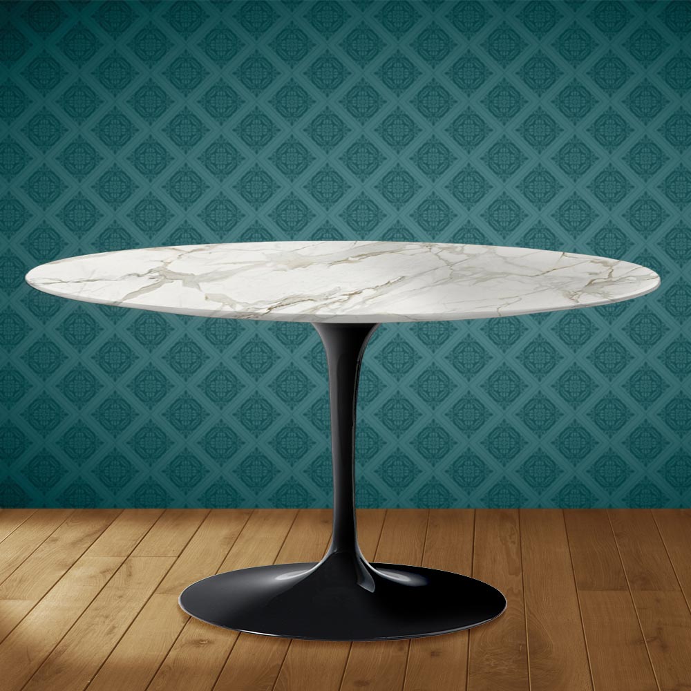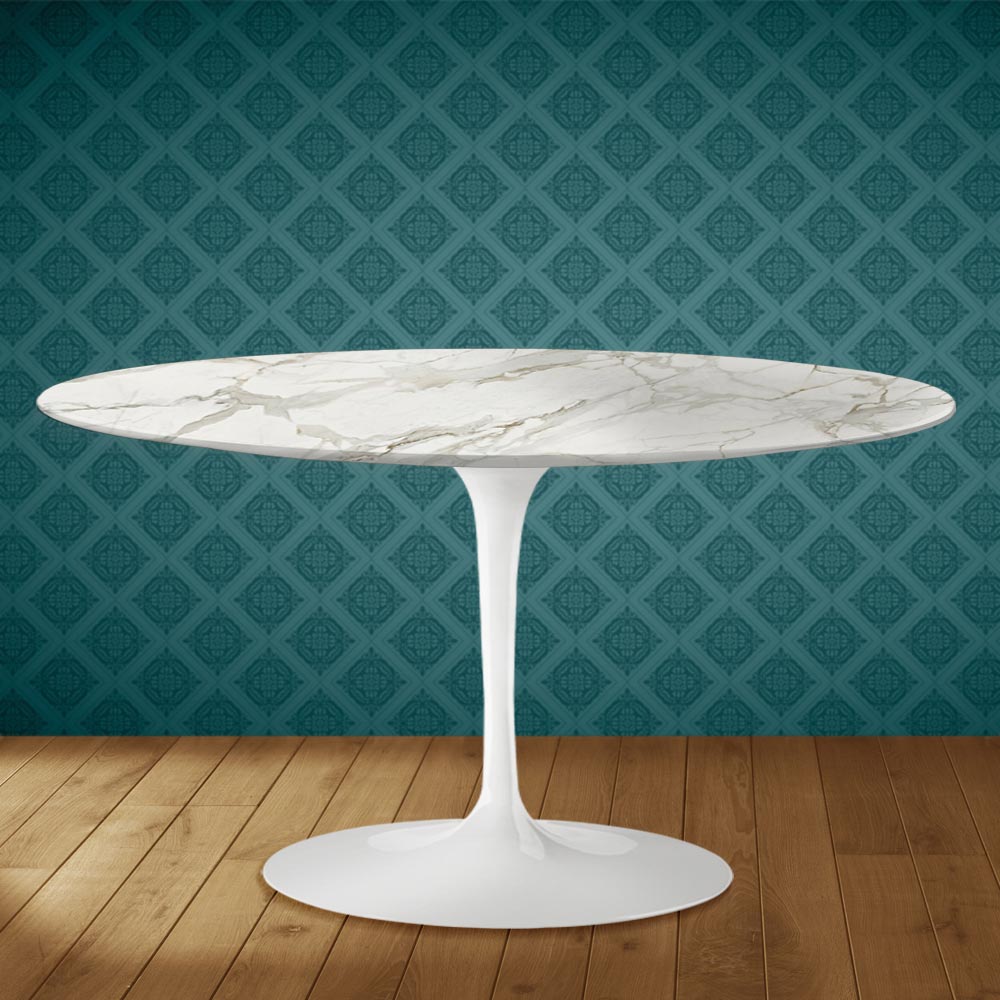 Coffee table with an oval polished ceramic top, glossy Calacatta marble effect , and a polished aluminum base, entirely made in Italy . This furnishing accessory has two unique features: the polished ceramic and its oval shape. Ceramic is characterized by its complex and highly refined graphics , which create a warm and welcoming atmosphere in any living space. This material is also high- quality and highly durable . The distinctive oval shape is increasingly popular for furnishing rooms with originality thanks to its sleek lines and its practicality and functionality.