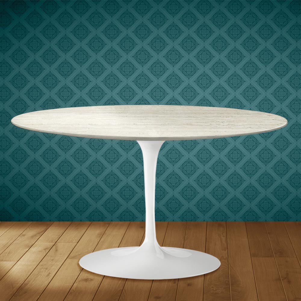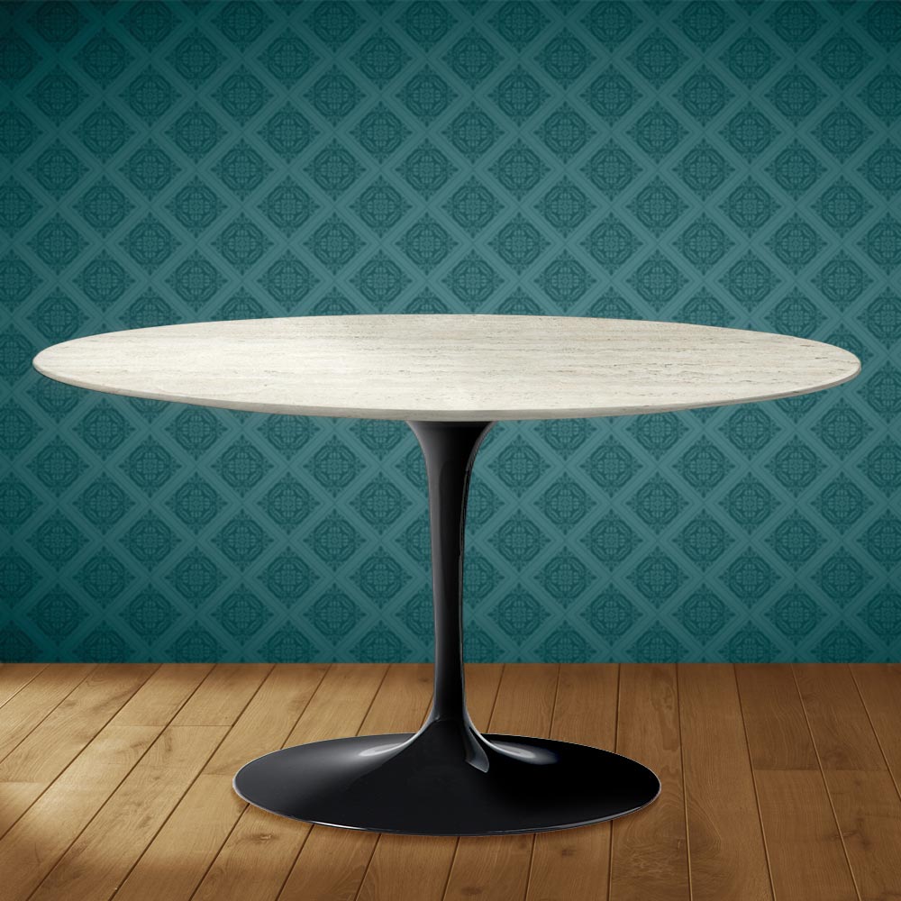 Coffee table with an oval top in Marmorio ceramic, a matte travertine marble effect , and a polished aluminum base, entirely made in Italy . This furnishing accessory has two unique characteristics: the Marmorio ceramic and its oval shape. The ceramic is characterized by its complex and highly refined graphics , which create a warm and welcoming atmosphere in any living space. This material is also high- quality and highly durable . The distinctive oval shape is increasingly popular for furnishing rooms with originality thanks to its sleek lines and its practicality and functionality.