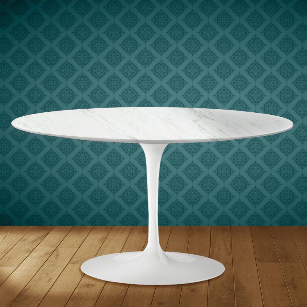 Coffee table with an oval Salina ceramic top, a glossy Carrara marble effect , and a polished aluminum base, entirely made in Italy . This furnishing accessory has two unique characteristics: the Salina ceramic and its oval shape. The ceramic is characterized by its complex and highly refined graphics , which create a warm and welcoming atmosphere in any living space. This material is also high- quality and highly durable . The distinctive oval shape is increasingly popular for furnishing rooms with originality thanks to its sleek lines and its practicality and functionality.
