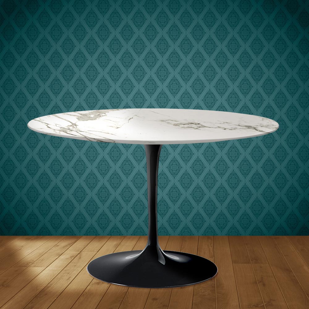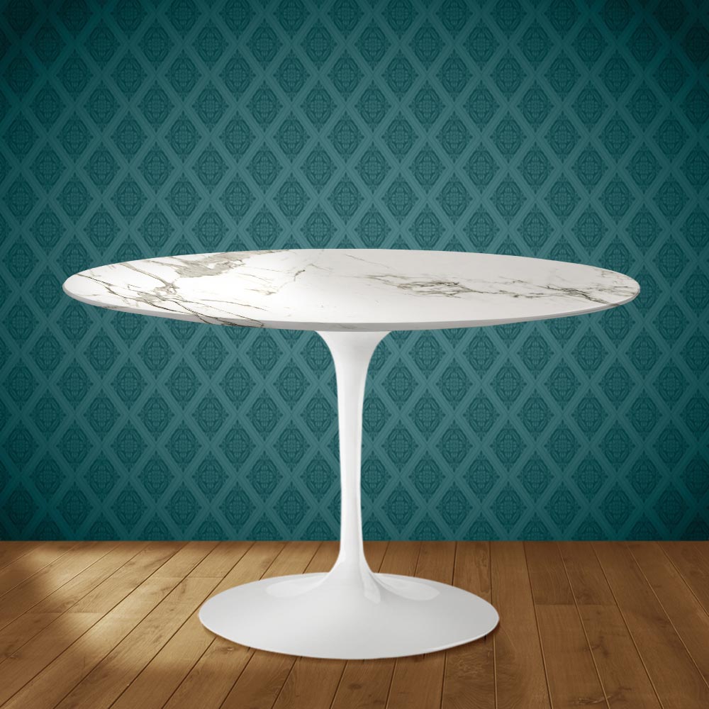 Dining table with a round Aura 22 ceramic top, a matte Carrara Statuario marble effect , and a polished aluminum base, entirely Made in Italy. The linear and refined finishes create a piece that easily fits into living rooms and kitchens furnished in a variety of styles. The combination of Aura 22 ceramic and polished aluminum makes this table suitable for all occasions, creating a welcoming space. Practicality and functionality are the key words to describe this product, without forgetting the elegance afforded by the unique color and graphics of the Aura 22 ceramic.