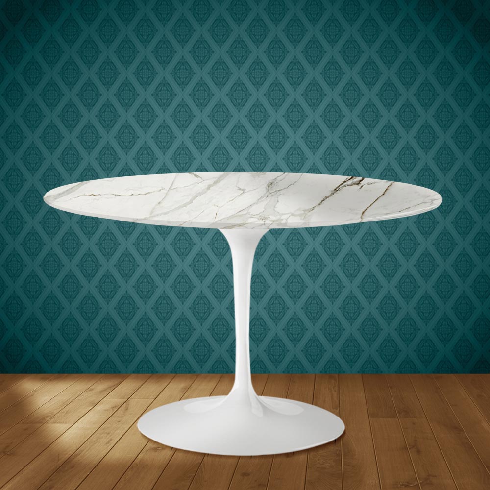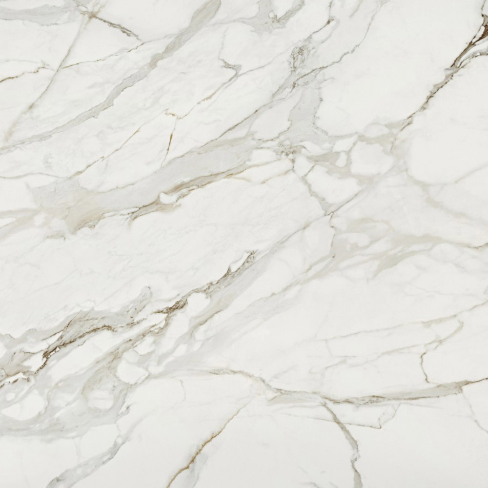 Dining table with a round polished ceramic top, glossy Calacatta marble effect , and a polished aluminum base, entirely Made in Italy. The linear and refined finishes create a piece that easily fits into living rooms and kitchens furnished in a variety of styles. The combination of polished ceramic and polished aluminum makes this table suitable for any occasion, creating a welcoming space. Practicality and functionality are the key words to describe this product, while also preserving the elegance afforded by the unique color and graphics of the polished ceramic.
