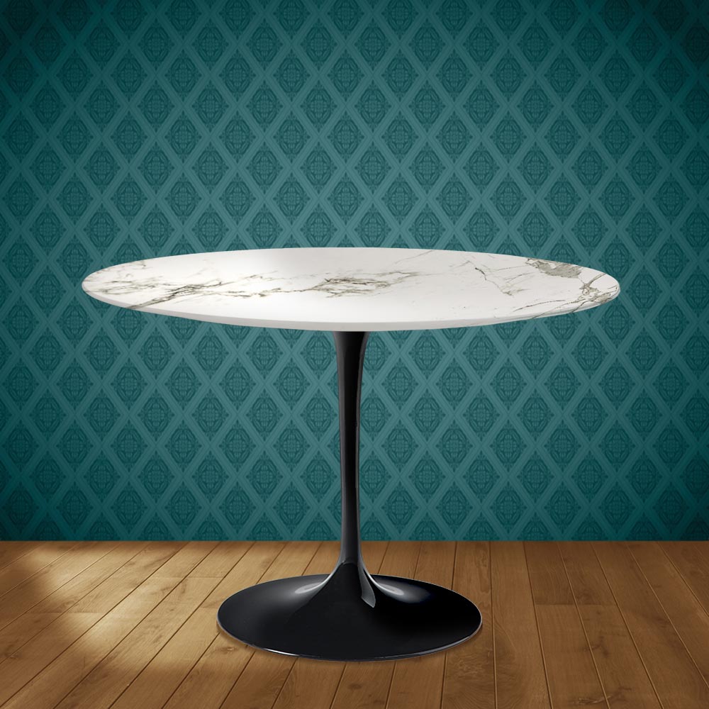 Dining table entirely Made in Italy with a round Aura 22 ceramic top, a matte Carrara Statuario marble effect , and a polished aluminum base. This table combines functionality and practicality with elegance and refinement thanks to its simple finishes and the unique Aura 22 ceramic. The product has a linear and refined shape that makes it suitable for complementing the decor of any living room or kitchen, adding a unique touch. The Aura 22 ceramic features complex and sophisticated colors and graphics that contribute to making the room welcoming and unforgettable. This table is the perfect idea for furnishing any space with taste and functionality .