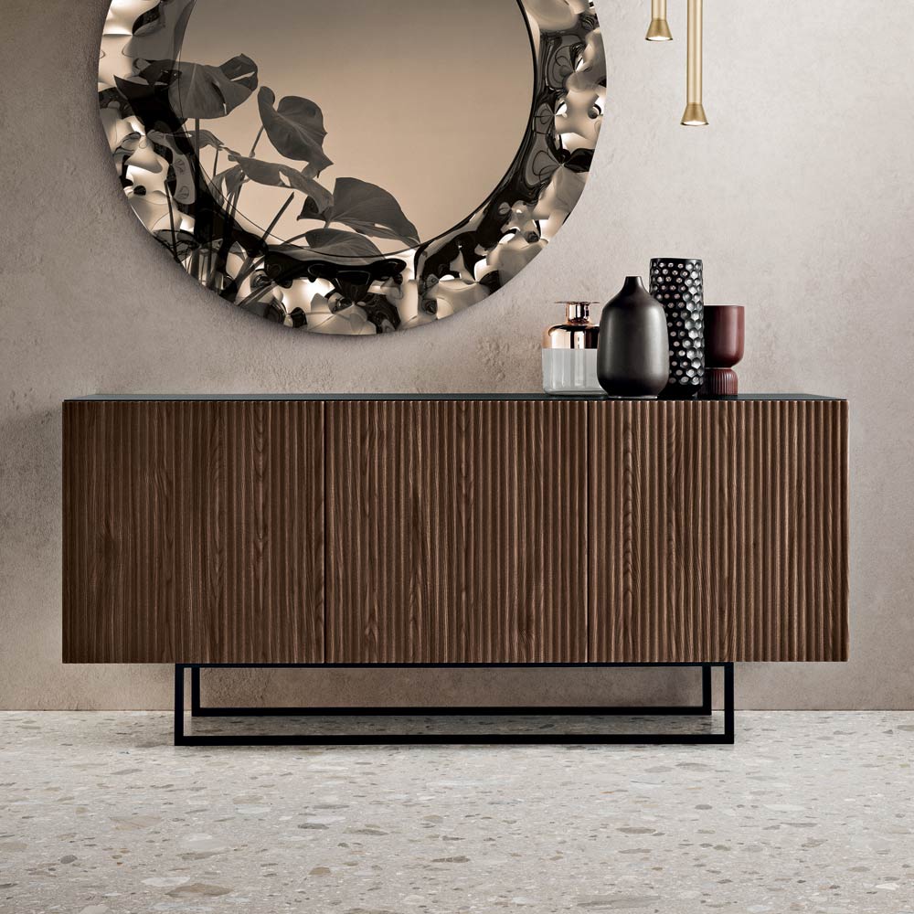 An elegant , Made in Italy designer sideboard , ideal for stylishly furnishing your living room or dining area . Its contemporary design stands out for the graphic strength of its surfaces, transforming the storage unit into a refined, visually striking decorative element.