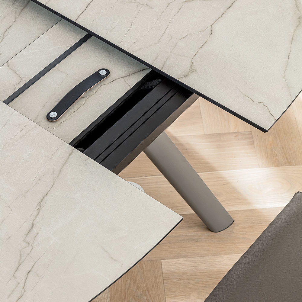 The HPL top adds brightness and refinement to the environment, recalling the veins of the stone with a resistant surface. Thanks to the central extension system , the table extends easily, offering additional space for guests or family lunches, maintaining a harmonious line even when open.