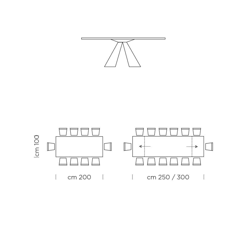 • L 200/300 x D 100 x H 75.3 cm 14 seats (2 extensions of 50 cm).