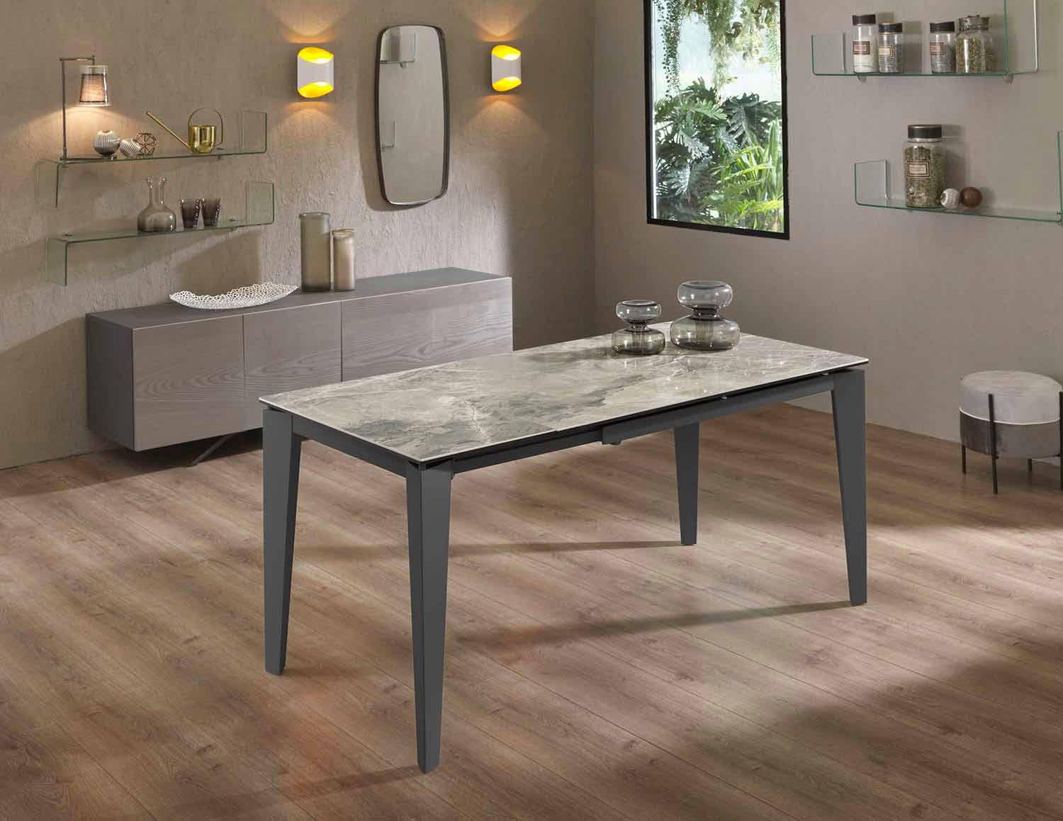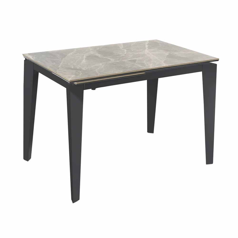 Syrta is a rectangular dining table characterized by the possibility of being extended up to 170 cm to obtain, when necessary, more space at the table and consequently greater comfort, ideal for hosting friends and relatives without sacrificing comfort. The table is made with a painted metal structure and ceramic top on anthracite-colored tempered glass that makes the table elegant and resistant at the same time and is also complete with internal extensions, also ceramic on white glass.
