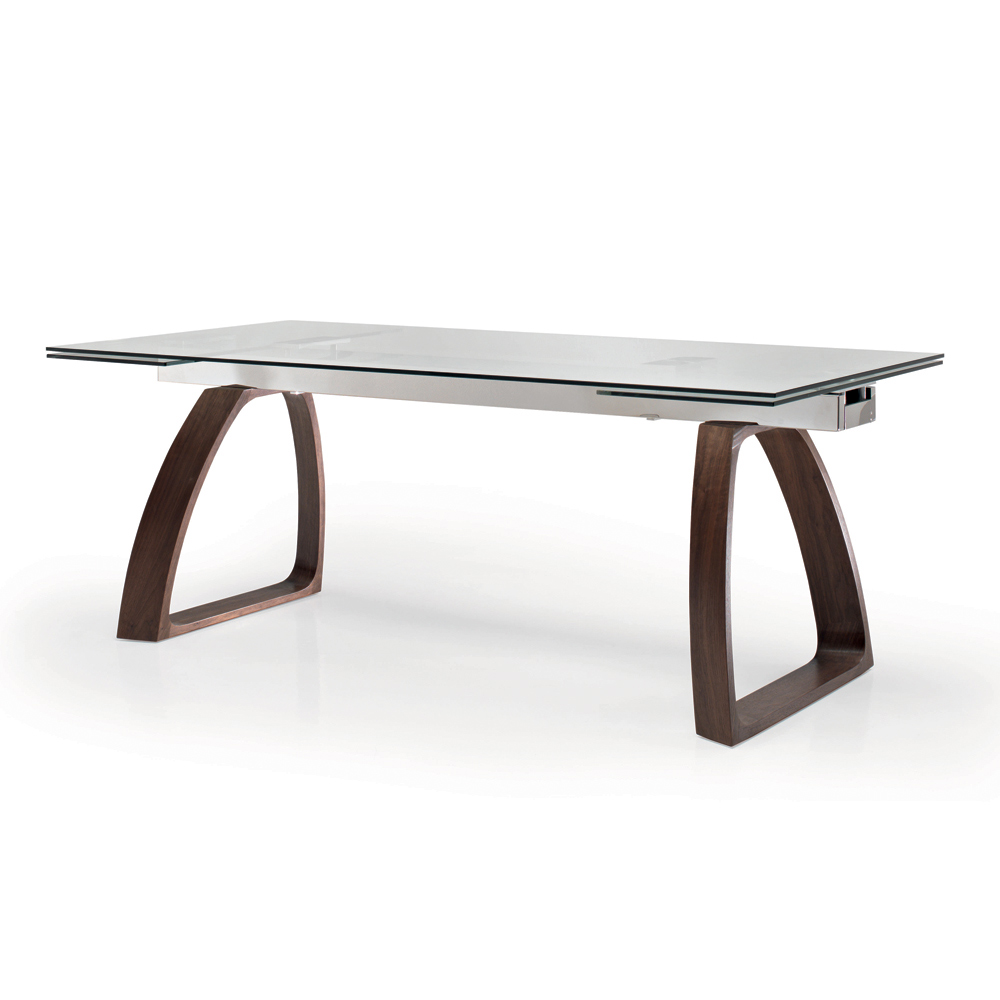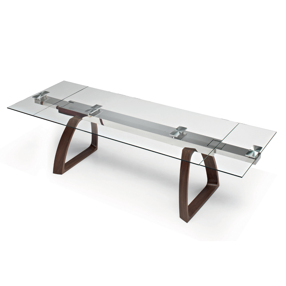 Dining table made in Italy with extendable top in extra-clear transparent glass (10 mm thick) and wooden legs. A furnishing accessory that embodies functionality and design for a result with a strong scenographic impact characterized by elegance and modern personality. Its peculiarity is represented by the possibility of extending the top up to a maximum length of 280 cm thanks to 2 internal extensions of 40 cm each made of glass which allow it to accommodate up to 12 people in total comfort. On a visual level, what is striking about its aesthetics is the wonderful combination of materials chosen which gives the table all its refined character and its contemporary soul , making it a perfect solution for furnishing dining rooms or kitchens with a modern style in an exclusive and refined way.