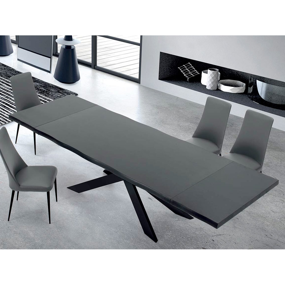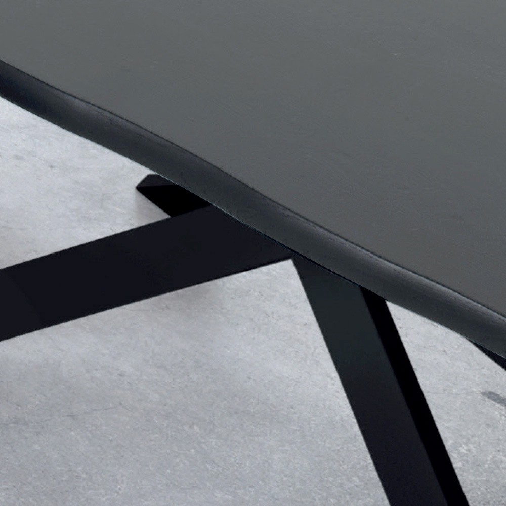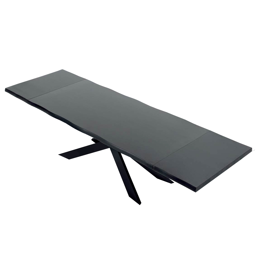 The Grotta modern extendable table is a perfect furnishing accessory ideal for furnishing all your environments by combining design and functionality. Handcrafted in Italy with excellent quality materials and 100% made in Italy. Characterized by a veneered wood top with irregular debarked edge and a black lacquered steel base. The base is decorated with a black steel joint frieze.